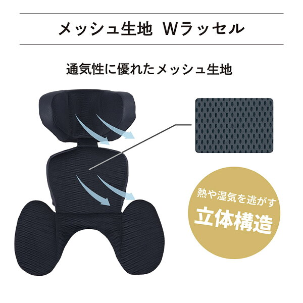 ●新生児クッション、本体カバーには、通気性とクッション性に優れたメッシュ生地「Wラッセル」を広範囲に使用。