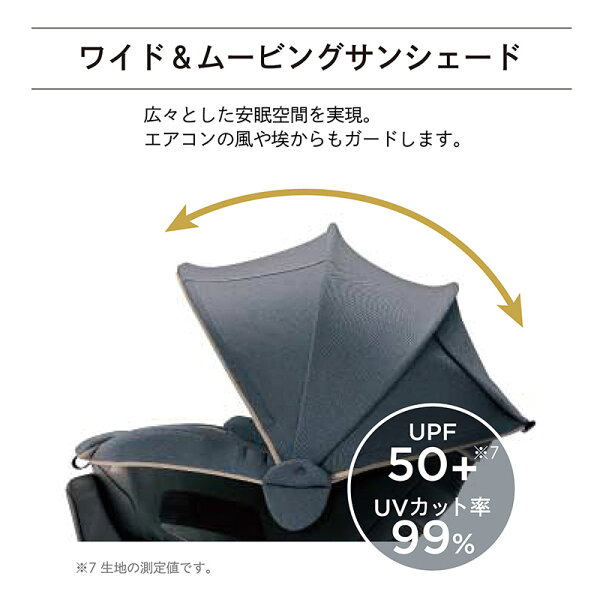 ●車内への紫外線、エアコン風から赤ちゃんを守る「フレキシブル&ワイドサンシェード」。お子さまの様子も確認できるメッシュウィンドウ付。