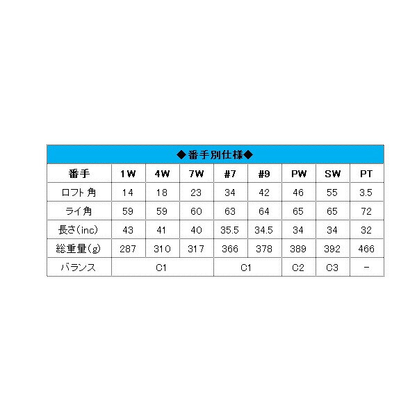 | スペック | カラー:■ブラック■ホワイト (上記カラーより1点お選びください) ■1W(ドライバー) ロフト角:14°/ライ角:59°/長さ:43inc/総重量:287g/バランス:C1 ■4W(フェアウェイウッド4番) ロフト角:18°/ライ角:59°/長さ:41inc/総重量:310g/バランス:C1 ■7W(フェアウェイウッド7番) ロフト角:23°/ライ角:60°/長さ:40inc/総重量:317g/バランス:C1 ■#7(7番アイアン) ロフト角:34°/ライ角:63°/長さ:35.5inc/総重量:366g/バランス:C1 ■#9(9番アイアン) ロフト角:42°/ライ角:64°/長さ:34.5inc/総重量:378g/バランス:C1 ■PW(ピッチング・ウェッジ) ロフト角:46°/ライ角:65°/長さ:34inc/総重量:389g/バランス:C2 ■SW(サンド・ウェッジ) ロフト角:55°/ライ角:65°/長さ:34inc/総重量:392g/バランス:C3 ■PT(パター) ロフト角:3.5°/ライ角:72°/長さ:32inc/総重量:466g |