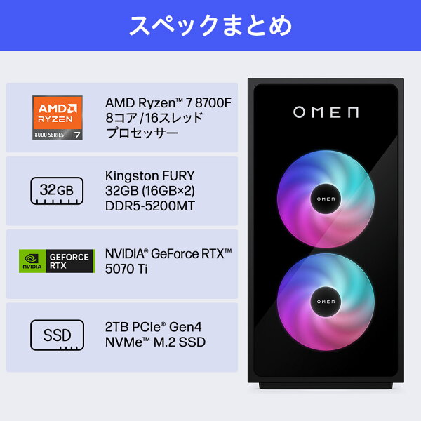 【公式・メーカー直販・送料無料】ゲーミング PC デスクトップ パソコン OMEN by HP 35L Windows11 Ryzen7 32GB 2TB NVIDIA GeForce RTX 5070Ti (型番:BG2P9PA-AAAA)