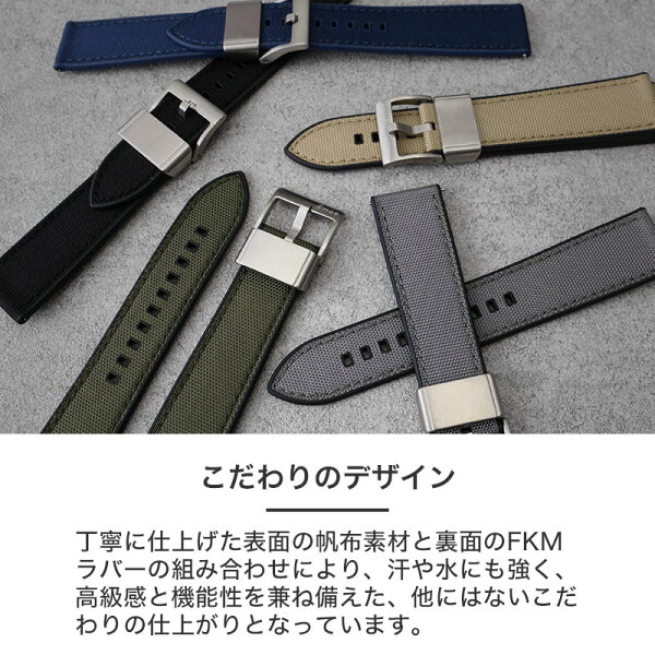 [ 商品ポイント ]帆布素材を使用表面にはきめの細かい帆布素材を使用し、FKMの無骨さをスマートにまとめ、高級感を引き立てます。圧倒的強度を誇るFKMラバー耐炎性、耐油性、耐化学薬品性、耐熱性、耐候性、耐オゾン性等他の合成ゴムの追従を許さない圧倒的強度を誇る「FKMラバー」を裏面に使用した高品質なラバーベルト。こだわりのデザイン丁寧に仕上げた表面の帆布素材と裏面のFKMラバーの組み合わせにより、汗や水にも強く、高級感と機能性を兼ね備えた、他にはないこだわりの仕上がりとなっています。バックルとメタルループMOD刻印を配したボリューム感のあるバックルとメタルループを採用し、ワンランク上のラバーストラップに仕上げました。腕時計にアクセントを与え、より高級感と存在感を演出します。カラーが選べるお手持ちの腕時計やお好みに合わせて、5色からお選びいただけます。着け心地抜群見た目よりもしなやかで肌触りの良いベルトは、アウトドアシーンだけでなく、様々なシーンで使用することができます。その柔軟性と快適な装着感は、ON/OFFを問わずどんな場面でも活躍します。