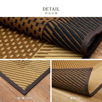 -------------------- こちらの商品は 北海道・沖縄・離島への配送ができません。 -------------------- -------------------- 10時ごろまでの受付で翌3営業日ごろまでに発送予定 *営業日:土日祝日を除いてカウントしてください *受付時間は10時から17時となっております -------------------- 上質な国産い草のみを使用した国産のい草ラグ。 い草の「染」にもこだわり、職人の業で鮮やかな色合いに染め上げました。 大胆なデザインですが北欧家具やモダンなテイストにもマッチするシックな色合いです。 裏面は、裏無しタイプと 不織布に滑りにくい加工を施した 裏有りタイプがあります。 厚みは、約4mm程度です。 縁は、約2cm幅です。 細めにし、柄を引き立てるようにしています。 日本の職人がひとつひとつ丁寧に織り上げた 繊細な美しさと肌触りを心いくまでお楽しみいただけます。 【い草の特徴】 ・室内の湿度を調整してくれる優れもの。 ・保温・断熱の効果があります。 ・弾力性・消音性がある安心素材。 ・空気浄化やアロマテラピー効果があります。 【お取り扱いについて】 ・色止め加工を施してありますが、自然素材のため、色落ちする場合があります。 ・自然素材のため、サイズに多少の誤差が生じます。 ・自然素材のため、カーペットシャンプー・洗剤などのご使用はおやめください。 ・抗カビ加工を施してありますが、自然素材のため、使用する状況によってはカビが発生する場合があります。 ・湿気の多い場所でのご使用はお避けください。 ・抗菌・防臭効果とは、い草の繊維がもつ特性です い草の繊維には、「細菌」の繁殖活動や増殖を抑制する特性があります 細菌の増殖が抑えられると、汗をかいたときなどにでる「いやな臭い」の原因となる悪臭の発生を防ぐ効果があります。 <収納の際は> ・収納の際は、掃除機などで表面の汚れをとり、日陰で干した後、湿気の少ない乾燥した暗い場所での保管をおすすめします。 約191×191cm ■生産地:日本 ■素材・成分: <裏貼無> 表面:国産い草100%紋織 縁:綿100%四方縁 ※機能:抗カビ・消臭 <裏貼有> 表面:国産い草100%紋織 裏面:不織布(滑りにくい加工) 縁:綿100%四方縁 ※機能:抗カビ・消臭 【画像について】 ・商品は、モニターによって色合いが異なって見える場合があります。 ・サイズによりデザインが異なります。 【お取り扱いについて】 <敷く前に> ・ラベル取り付けの際に打ち付けているタグピンはハサミなどで完全に取り除いてからご使用ください。 ・ご使用になられる前に、乾いた布で表面を軽く拭いてください。 ・強く拭いたり、濡れた布で拭くと変色する恐れがありますのでご注意ください。 ・直射日光が強く当たる場所でのご使用はおすすめできません 日焼けをし、変色してしまう可能性があります。 <敷いた際に> ・抗カビ加工を施してありますが、湿気の多い場所でのご使用は、カビの発生の原因となります 時々窓を開け、換気することをおすすめします。 ・万が一カビが発生した際は、日陰で干した後、柔らかいブラシ等で掃いてください (直射日光が当たる場所で干すと、日焼けや変色の原因となります。) ・ジュースやコーヒーなどこぼした際は、乾いた布で拭いてください。 ・長期間敷き詰めたままにしておくと、裏面と床が密着する場合があります ときどき使用場所をずらしたり、日陰で干したり、または、端を持ち上げて風を通してください。 ・滑りやすい場所でご使用する際は、滑り止めの併用をおすすめします。 ----------- 着日指定をお受けすることができません 発送後、お問い合わせ番号をご連絡いたしますので 配送会社と調整をお願いいたします -----------