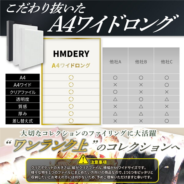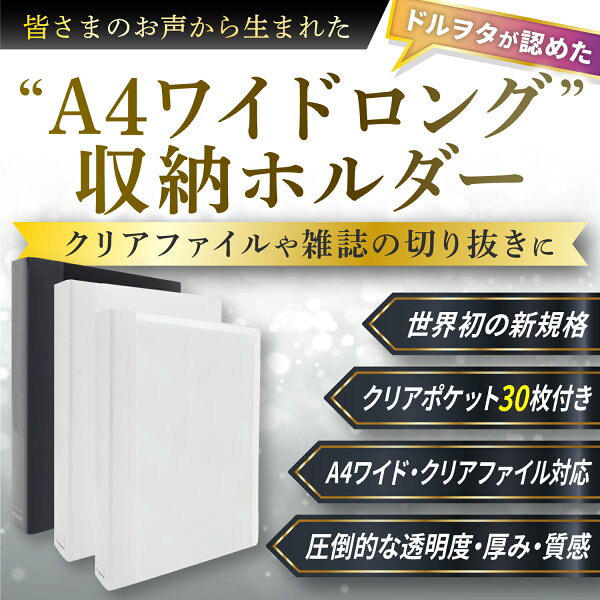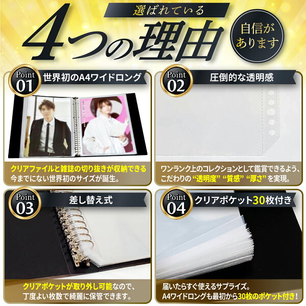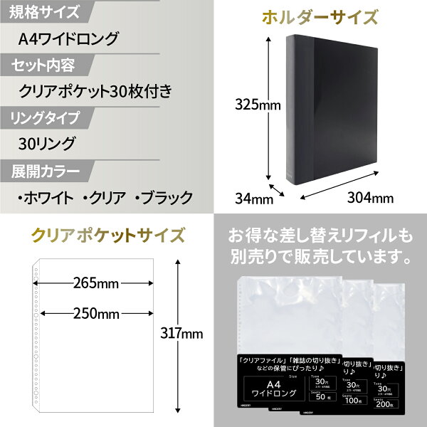 【 A4ワイドロング 】クリアファイルやアイドル誌切り抜きに 差し替え式 バインダー クリアポケット30枚 アイドル 韓流 雑誌切り抜き リフィル 30穴 2穴 4穴 a4変形ワイド a4ワイド クリアファイル収納ホルダー 白 黒 クリア 単品 セット ハムデリー HMDERY