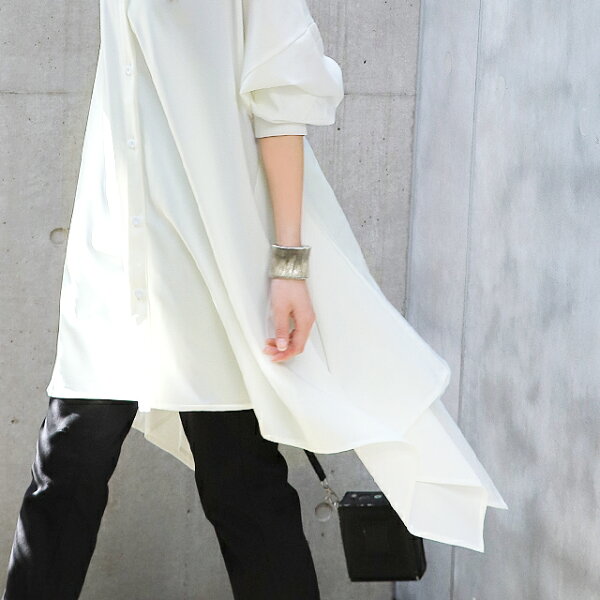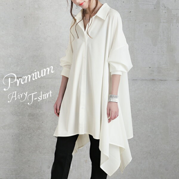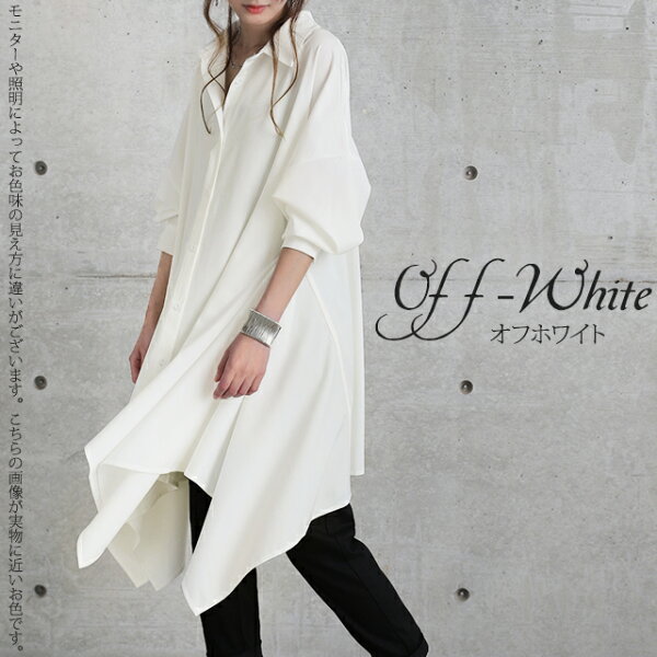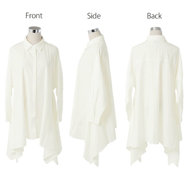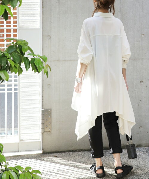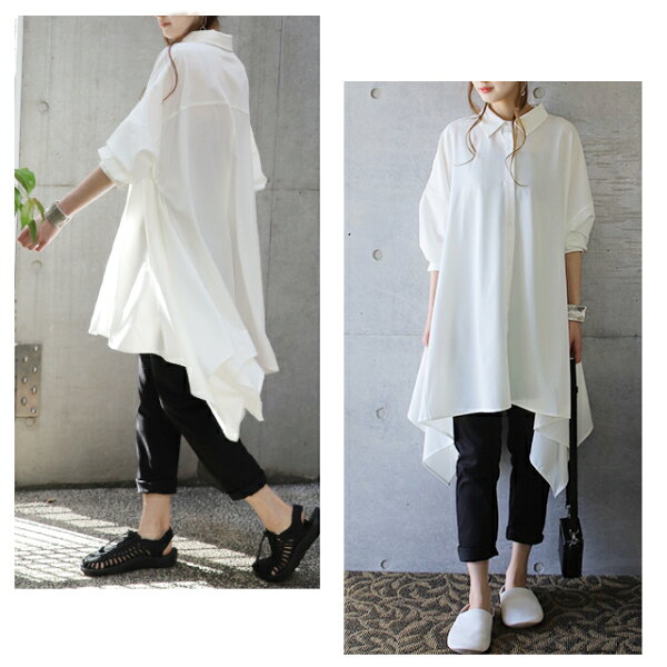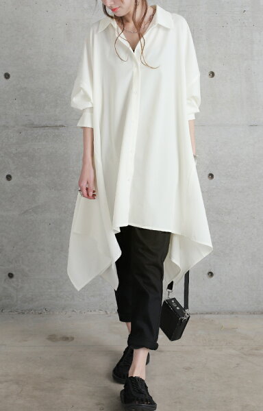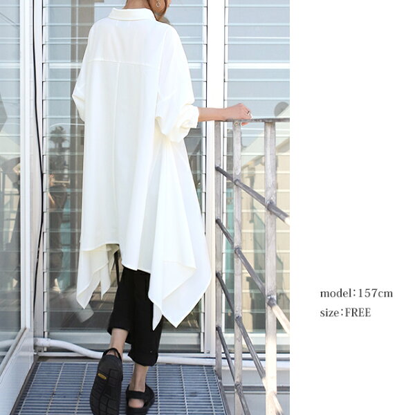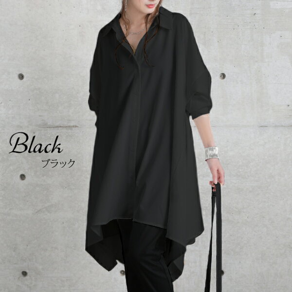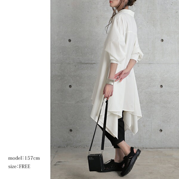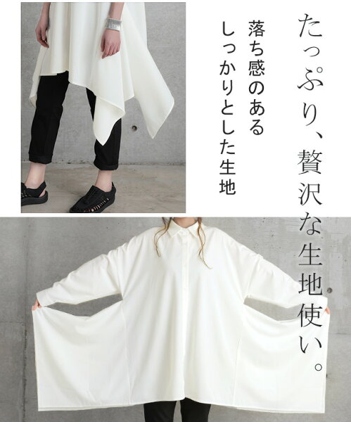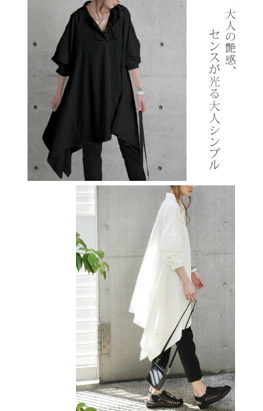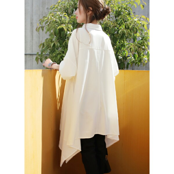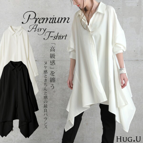 シャツ レディース ブラウス トップス きれいめ シャツチュニック 長袖 体型カバー アシンメトリー アシメ ロングシャツ ロング 大きいサイズ 無地 変形 白 黒 ホワイト ブラック 秋 冬 HUG.U