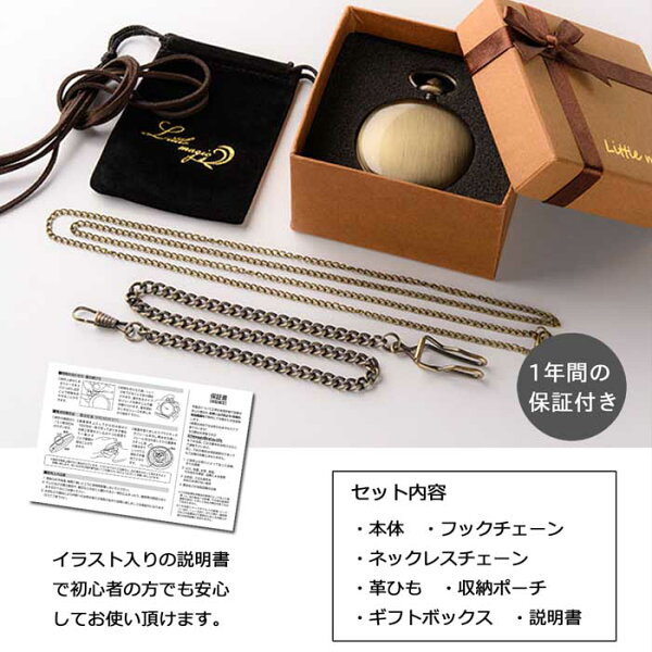 【 充実のセット内容 】懐中時計・革ひも・懐中時計用チェーン (ネックレス チェーン・ベルトチェーン)収納ポーチ・ギフトBOX・簡易取扱い説明書付き保証書(初心者にも安心)