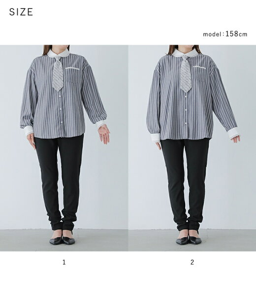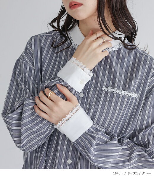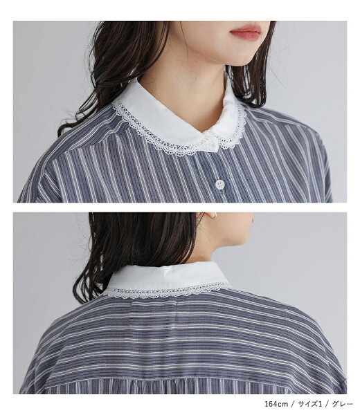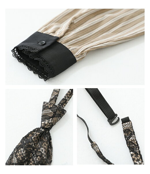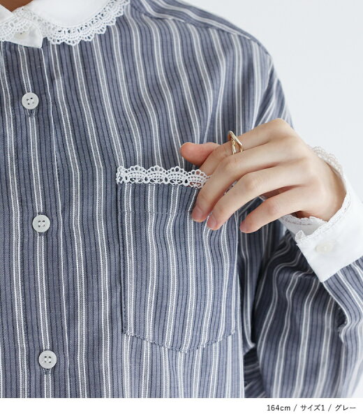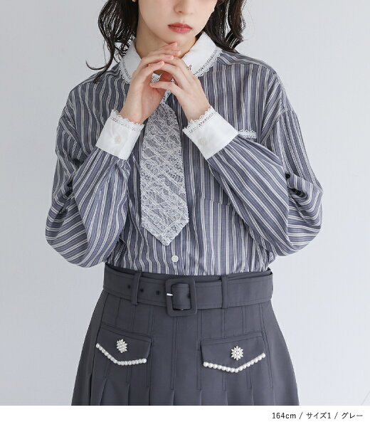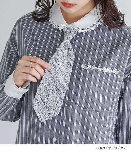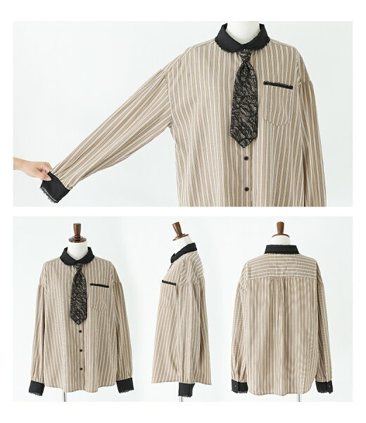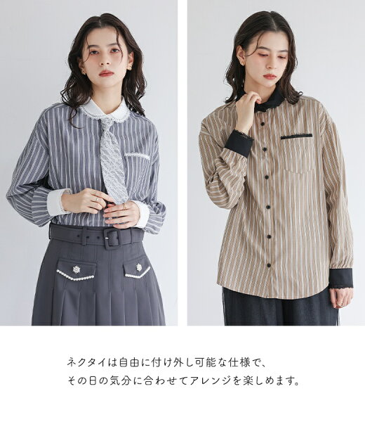 取り外しできるネクタイがついた、ストライプ柄の長袖シャツ。メンズライクになりがちなストライプ柄も、丸襟とレース使いで女性らしく仕上げました。ネクタイはストライプ生地にレースを重ねて、甘すぎない大人のデザインに。長さの調節も可能で、お手持ちのブラウスやシャツと合わせることでコーディネートの幅が広がります。襟やカフスは無地で切り替えることで、カジュアルすぎず洗練された印象に。ネクタイを外しても、襟元や袖口、ポケットに施されたレースが上品なアクセントになります。1枚で着るのはもちろん、ニットやベストのインナーとしても活躍する、着回し力抜群のアイテムです。