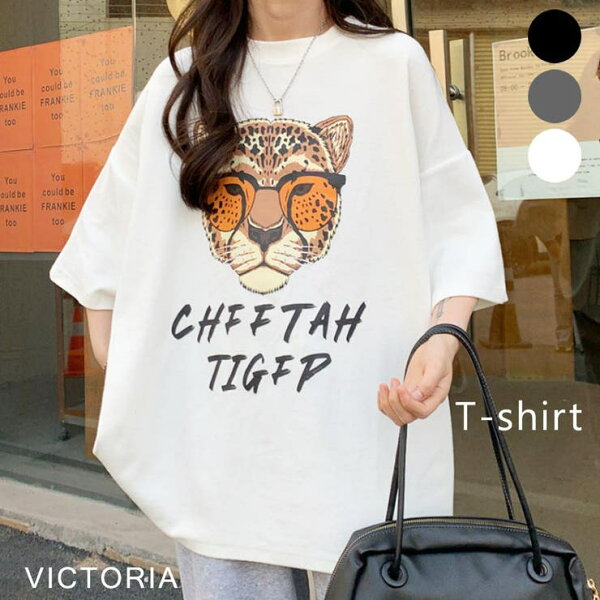 VICTORIA ユニークプリント Tシャツ 半袖 オーバーサイズ アニマル サングラス カジュアル 韓国ファッション レトロ アメカジ ストリート レディース メンズ ユニセックス ブラック グレイ ホワイト 22F22492 トップス