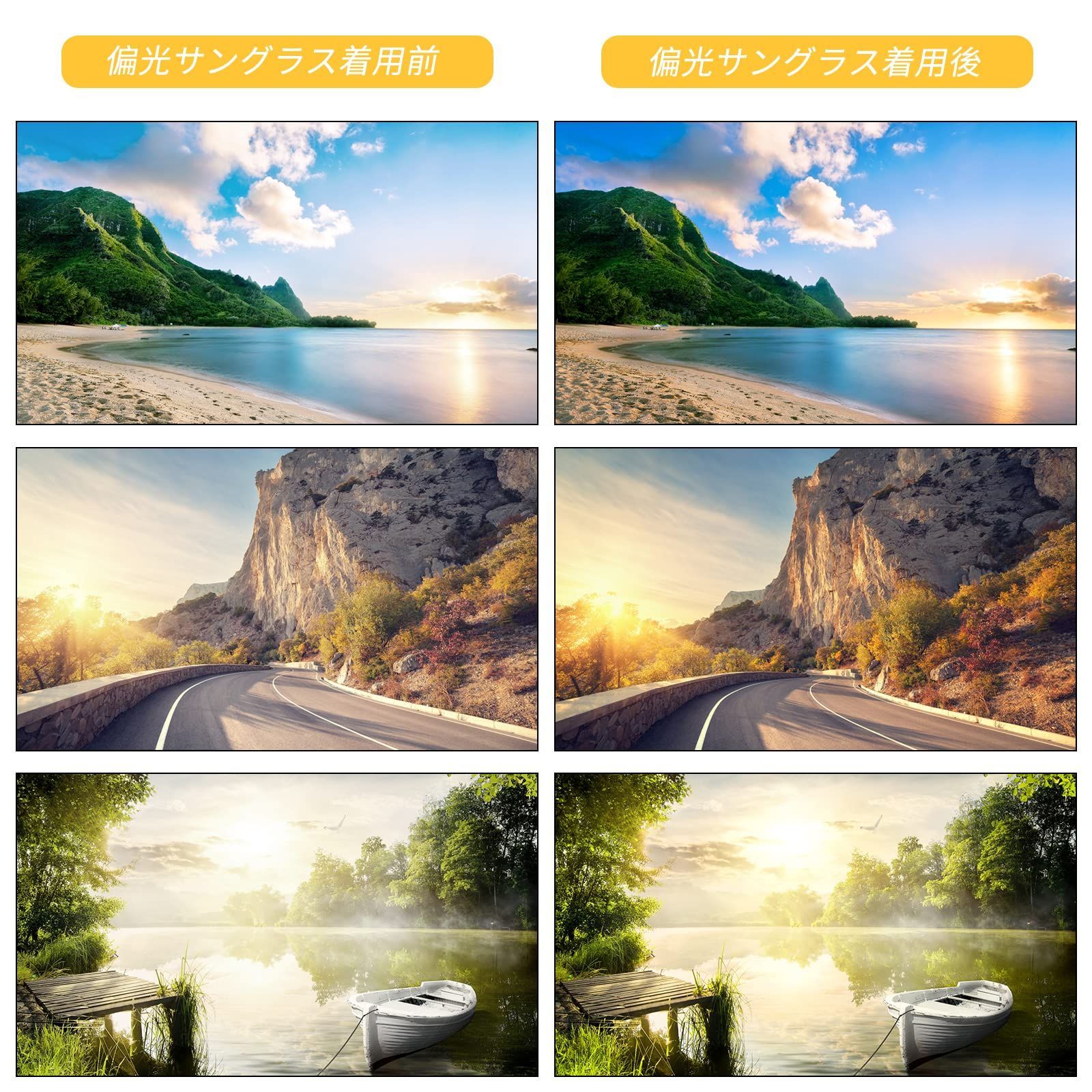 【明るいビジョン】イエロー系の色の偏光レンズは、他の色と比較して視界が明るく見えます。そのため、夜釣りや夕方以降の運転など、視界が暗い時に使うのにおすすめです。