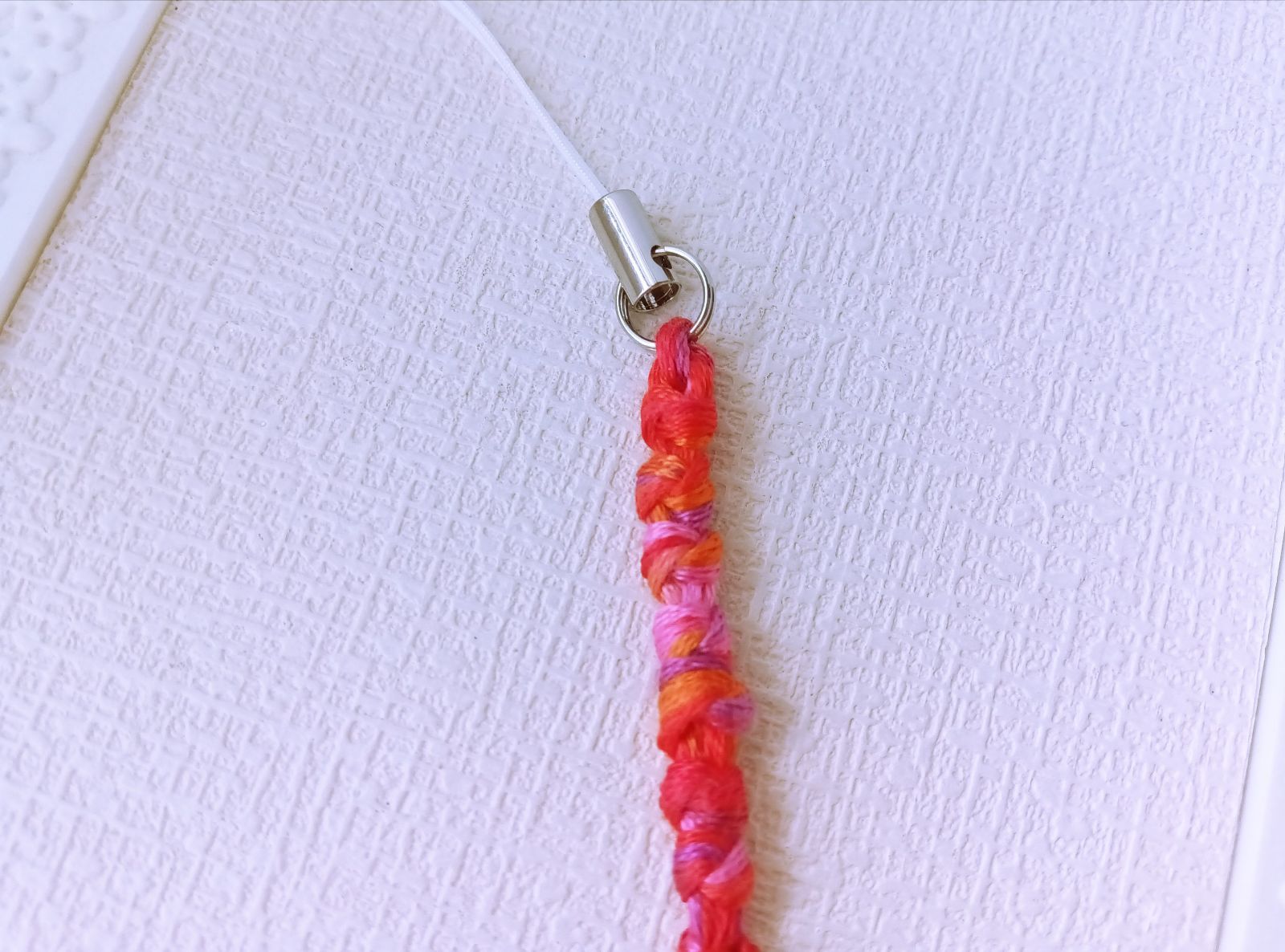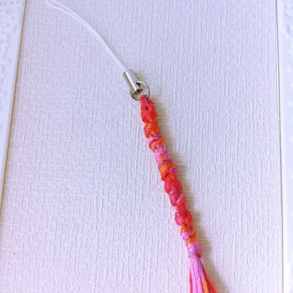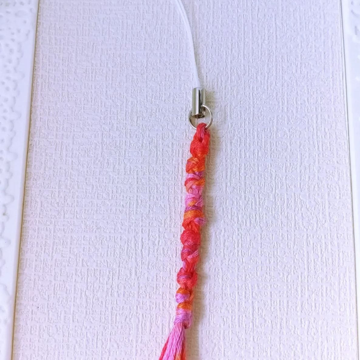 刺繍糸のレッド系グラデーションカラーで、ストラップを作成しました。