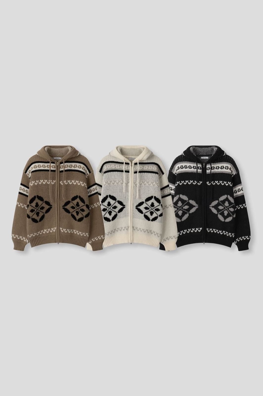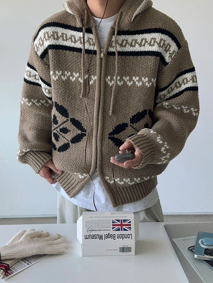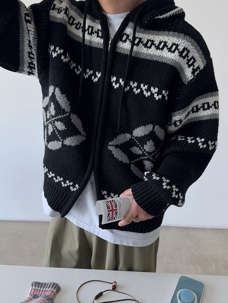 冬新作 ノルディック WHOフードジップアップニット 大ヒット商品 雪花 ジップアップ ジャガード 厚手 ユニセックス オーバー
