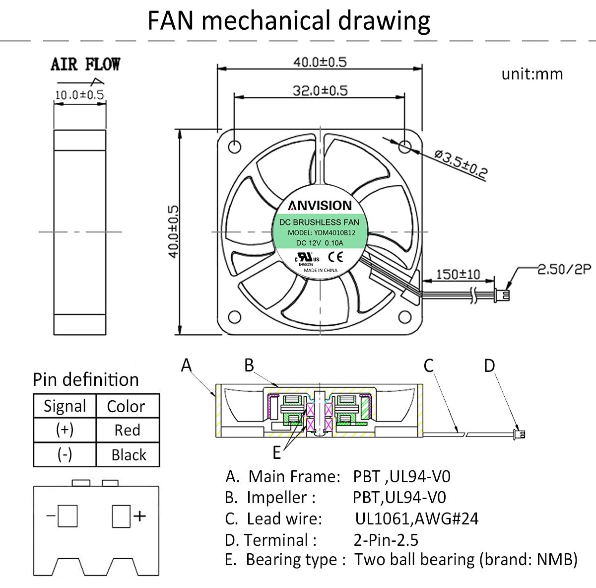ANVISION 40mm x 10mm DC 12V ブラシレス冷却ファン デュアルボールベアリング、2ピン