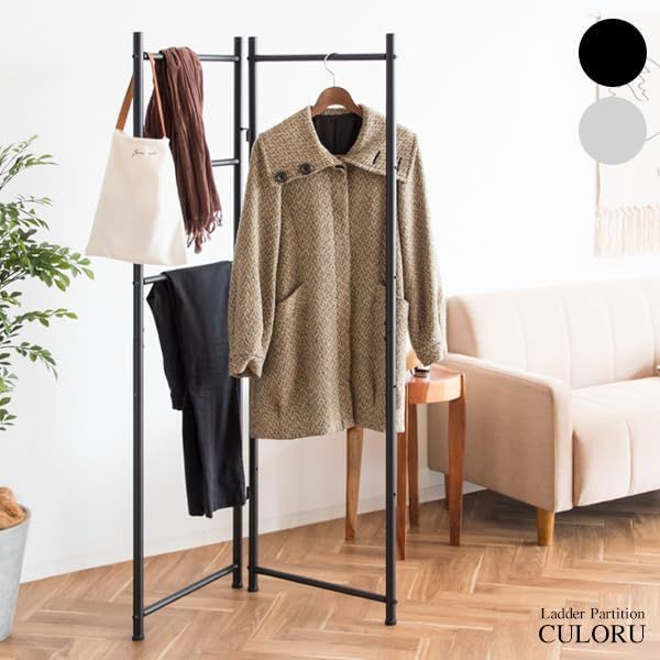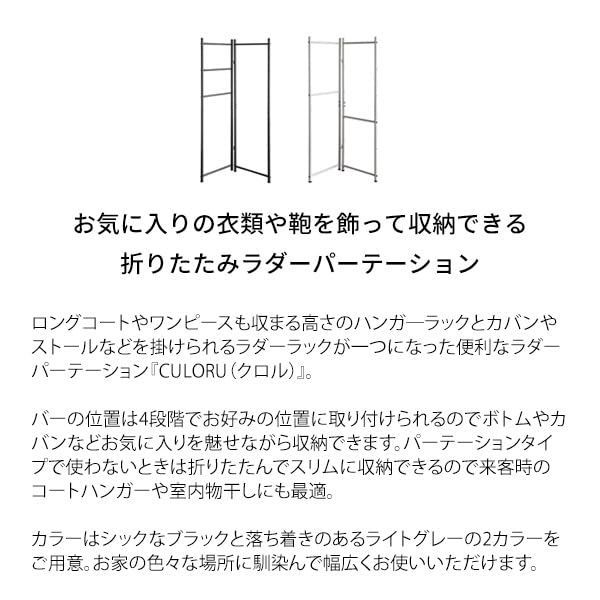 ロングコートやワンピースも収まる高さのハンガ―ラックとカバンやストールなどを掛けられるラダーラックが一つになった便利なラダーパーテーション『CULORU(クロル)』。バーの位置は4段階でお好みの位置に取り付けられるのでボトムやカバンなどお気に入りを魅せながら収納できます。パーテーションタイプで使わないときは折りたたんでスリムに収納できるので来客時のコートハンガーや室内物干しにも最適。カラーはシックなブラックと落ち着きのあるライトグレーの2カラーをご用意。お家の色々な場所に馴染んで幅広くお使いいただけます。