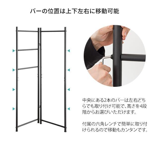 中央にある2本のバーは左右どちらでも取付可能で、高さを4段階から選んで取り付けることができます。付属の六角レンチで取り付けられるので、移動も簡単です。