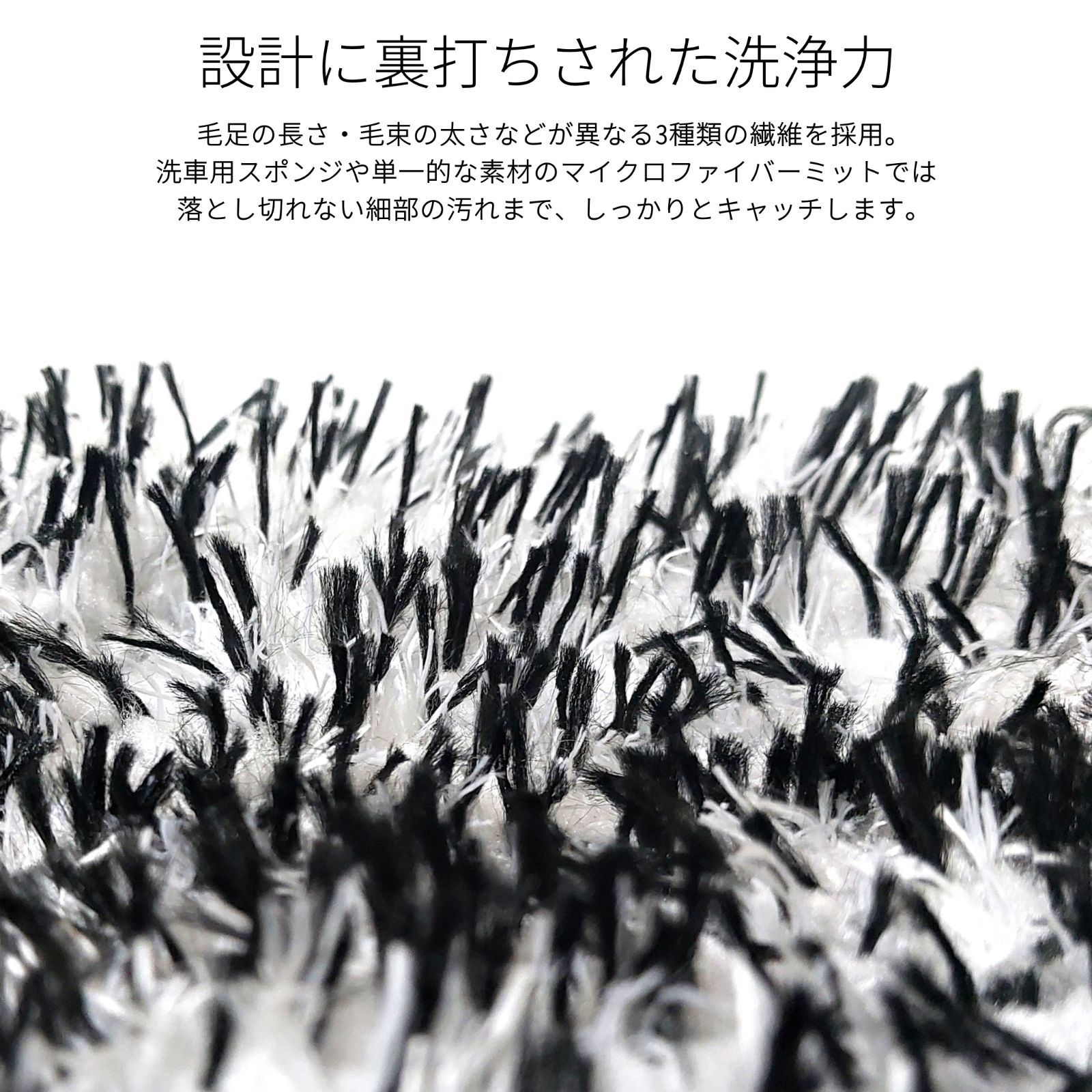 一般的な洗車スポンジや単一素材で製造されたミットとは一線を画する、プロ仕様のウォッシュミットです。毛足の長さ・毛束の太さなどが異なる3種類の繊維を採用。細部の汚れまで逃さず、しっかりとキャッチします。