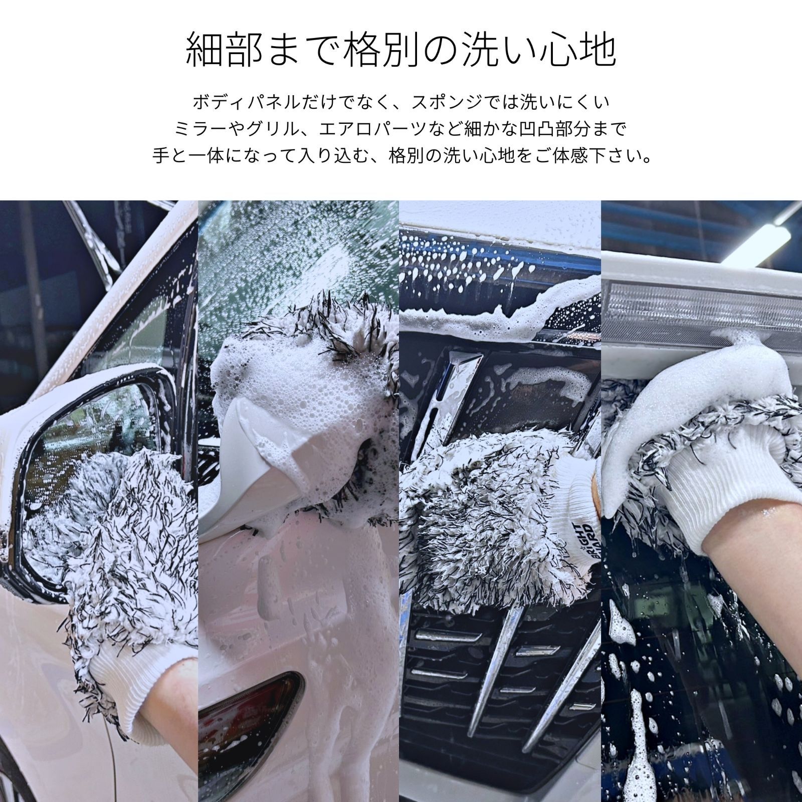 ドアやボンネットなど大きなボディパネルだけではなく、スポンジでは洗いにくいミラーやグリル、エアロパーツなど細かい凹凸部分まで、手と一緒になって入り込む、格別の洗い心地をご体感頂けます。