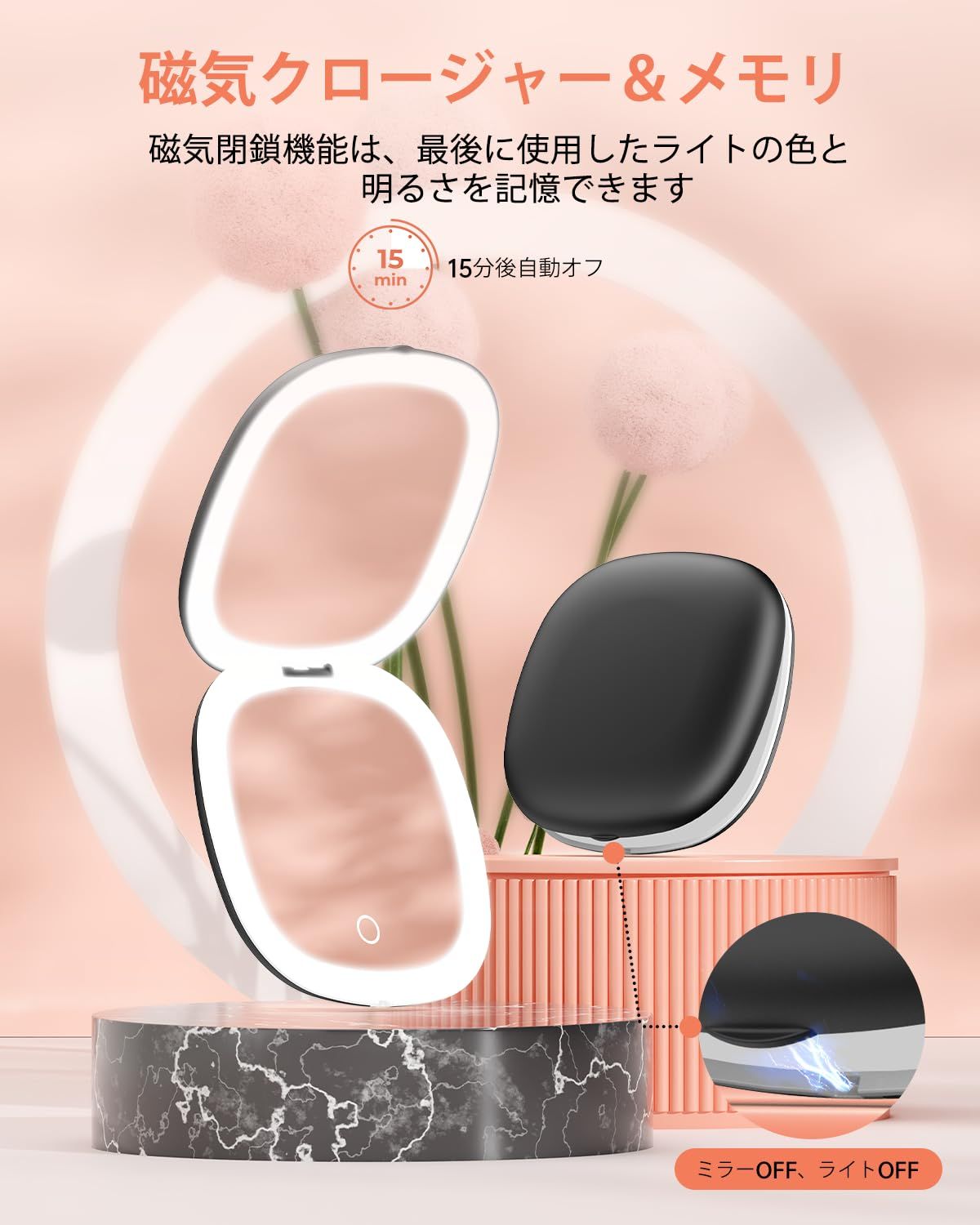 LEDミラー 携帯ミラー 1X/10X両面鏡 両面ライト付き 拡大鏡 明るさ調整 三色調光 メモリー機能 タッチ(ブラック)