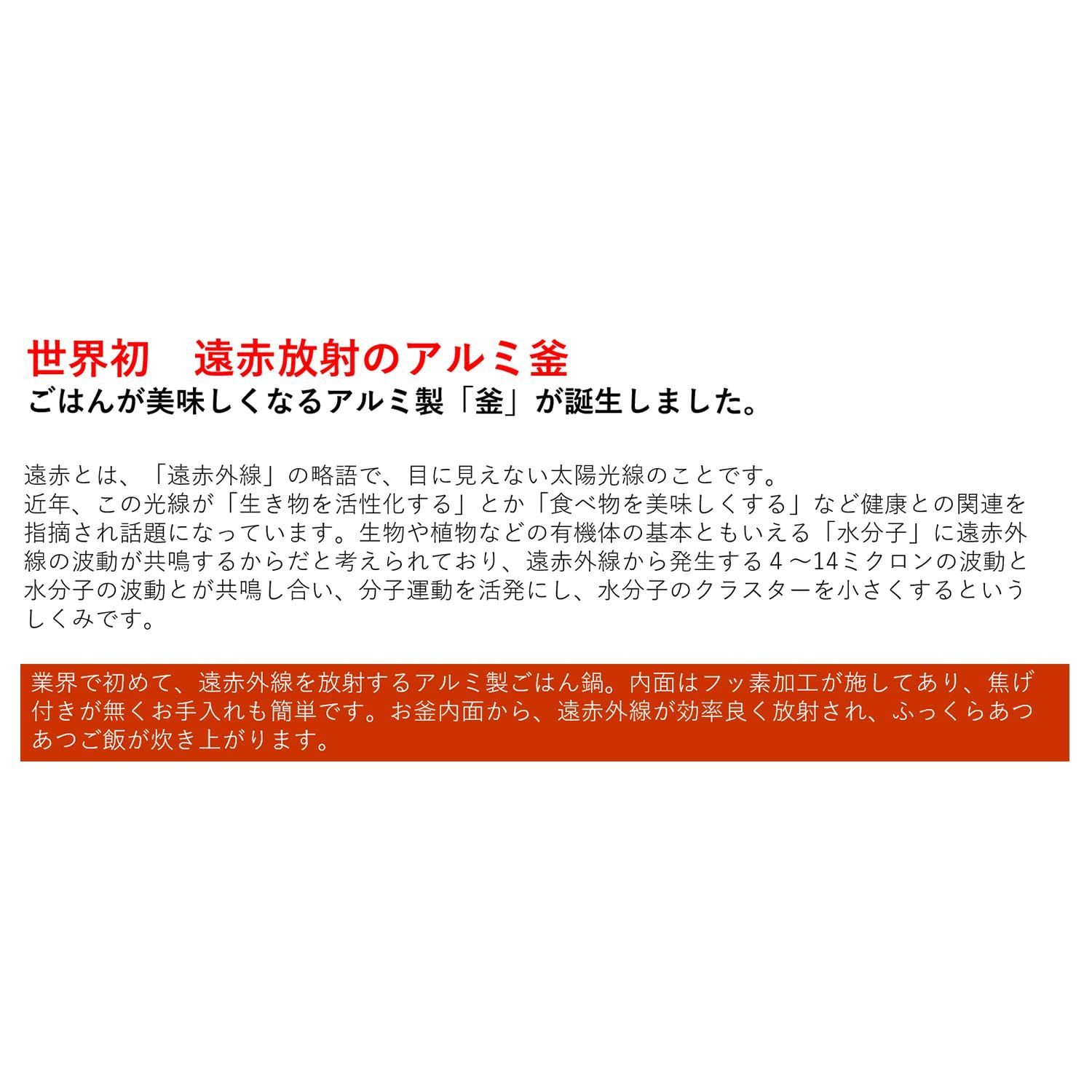 ご覧いただきありがとうございます。 当店では他サイトにも商品を販売しているため まれに売り切れや取り寄せ中となる場合がありますがご了承ください。 砺波商店(Tonamishouten) ご飯釜 遠赤 手軽に作れる 黒釜飯 1合用 木蓋 付き 日本製 アルミ製 アウトドア キャンプ 直火OK 塗りなおし可能 サイズ:内寸 直径115xH80mm 本体重量:780g 素材・材質:アルミ製(フッ素加工) 生産国:日本 鋳物産業として400年の歴史がある、富山県高岡市で造られる金属食器 業界で初めて、遠赤外線ほ放射するアルミ製ごはん鍋。お釜内面から、遠赤外線が効率よく放射され、ふっくら炊き上がります 伝統工芸品から、業務用・一般家庭用まで幅広くお使いいただけます 木蓋の裏面は、白と黒の2種類ございます。どちらかの木蓋が同封になります。使用上違いはございません。 老若男女に愛される釜飯 おうちごはんで、いつもの日常にひと手間で美味しいご飯を フッ素加工が施されているので、汚れが落としやすい 羽釜は鉄やアルミでできているため、熱伝導が良く、温まりやすく冷めやすい性質 そのため短時間で炊きあがり、熱が釜全体に伝わるのでお米が均一に加熱され、炊きムラが起こらない シャキッとした歯ごたえのご飯に 最後までご確認頂き誠にありがとうございました。 上記をご確認頂き、ご購入いただけましたら幸いです。 何かご不明な点がございましたらお気軽にメッセージからお問い合わせ下さい。