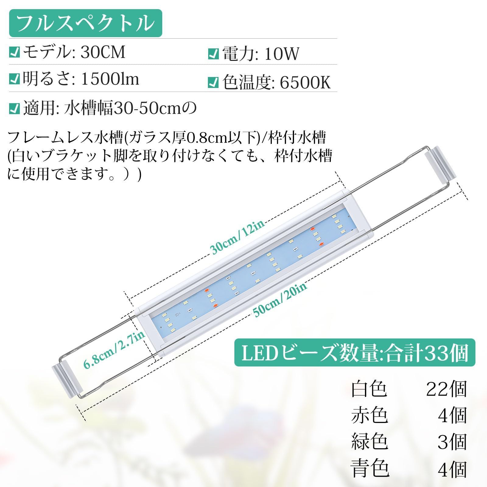 このFEDOUR30cm水槽LEDライトは、水槽幅30~50cmのフレームレス/枠付水槽に適しています。パワー10W、色温度6500 K、1500lm超高輝度。水草の成長、水槽の照明に適用します。