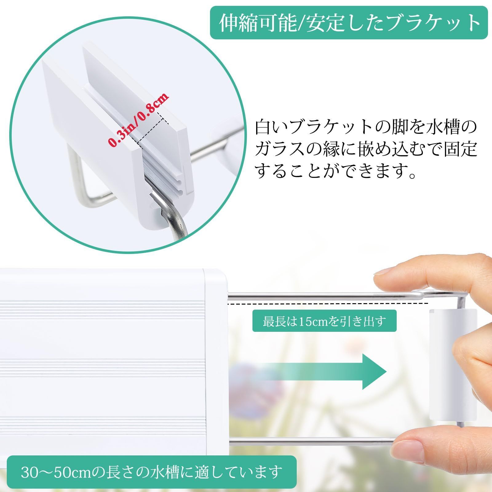 「伸縮可能の安定したブラケット」: この水族館植物ライトのブラケットは、両端で約 15cm調整できます。 独特な固定用ブラケットフにより、この水槽ランプが水槽上でより安定し、フレームレスのガラス水槽/枠付水槽に適しています。