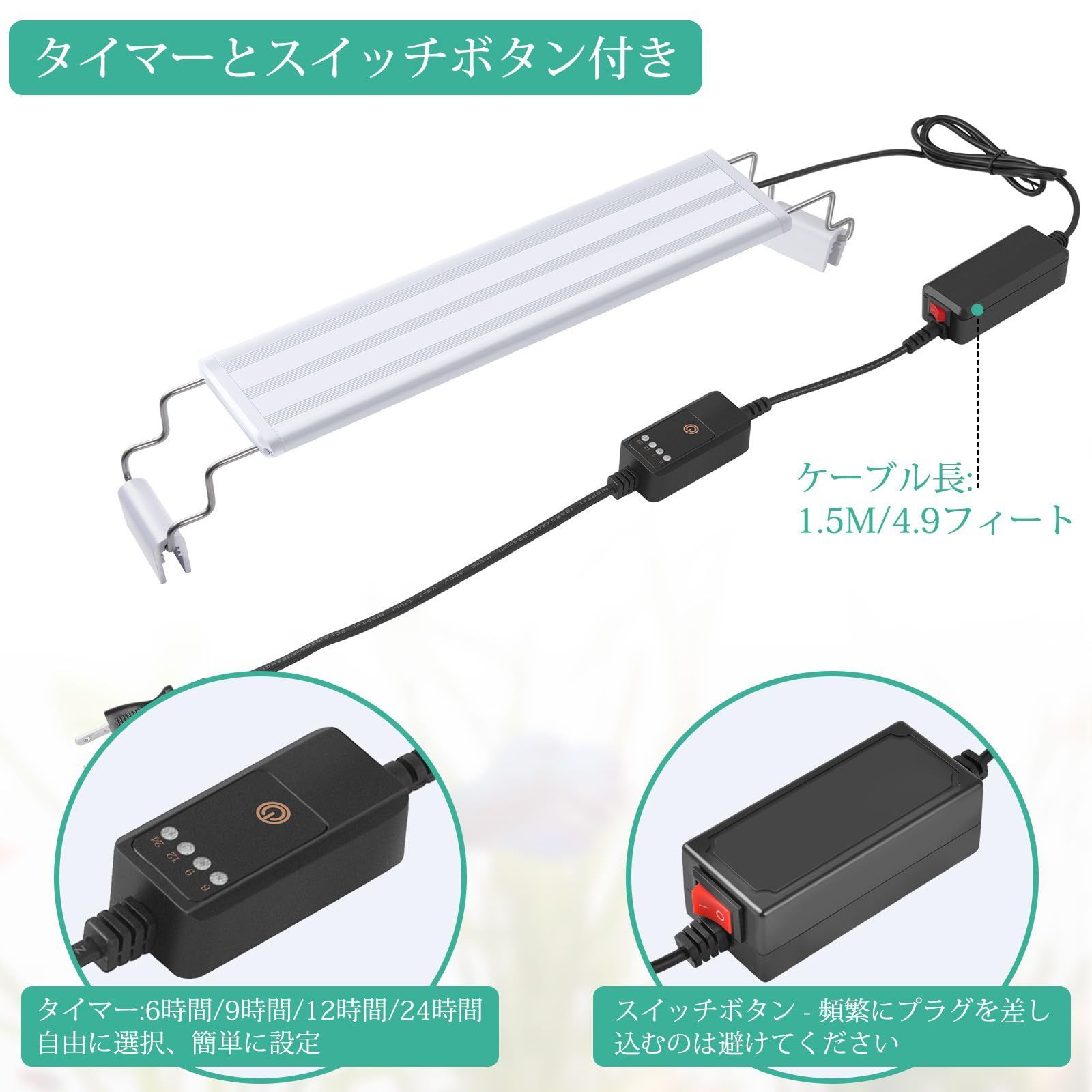 「タイマー+オン/オフボタン付き」:設定が簡単なタイマーボタンを使用して、この水槽ライトの点灯時間(6時間/9時間/12時間/24時間)を自由に設定できます。N・OFFスイッチが付き、使いやすくなりました。