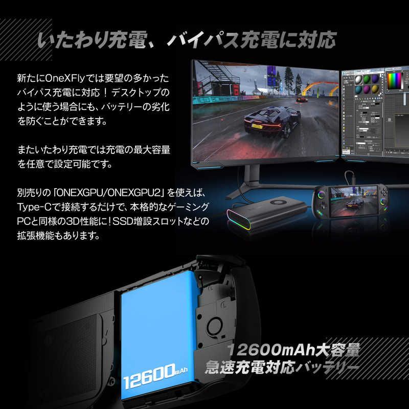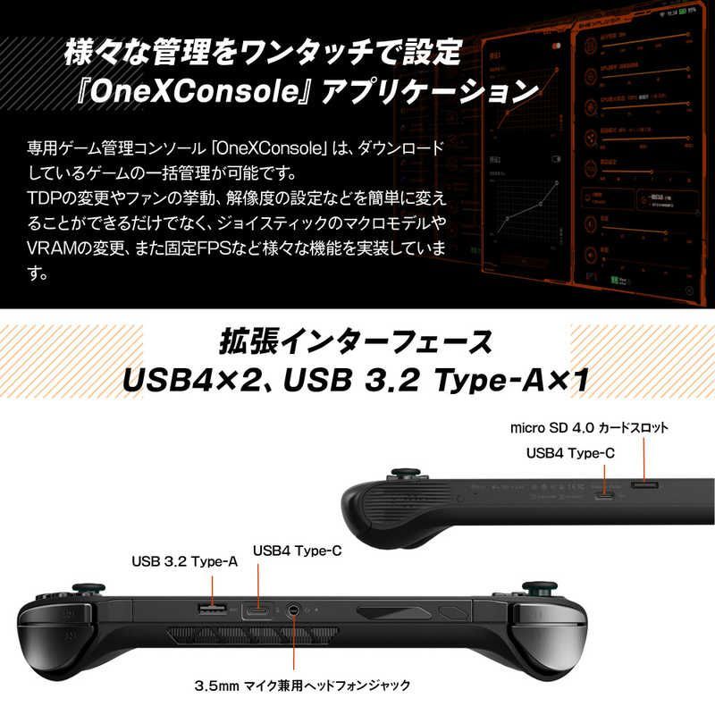 TDPの変更やファンの速度などをワンタッチできるユーティリティソフトOneXConsoleを搭載し、ボタンの割り当てや、バッテリーのいたわり充電など、設定変更を行うことが可能です。