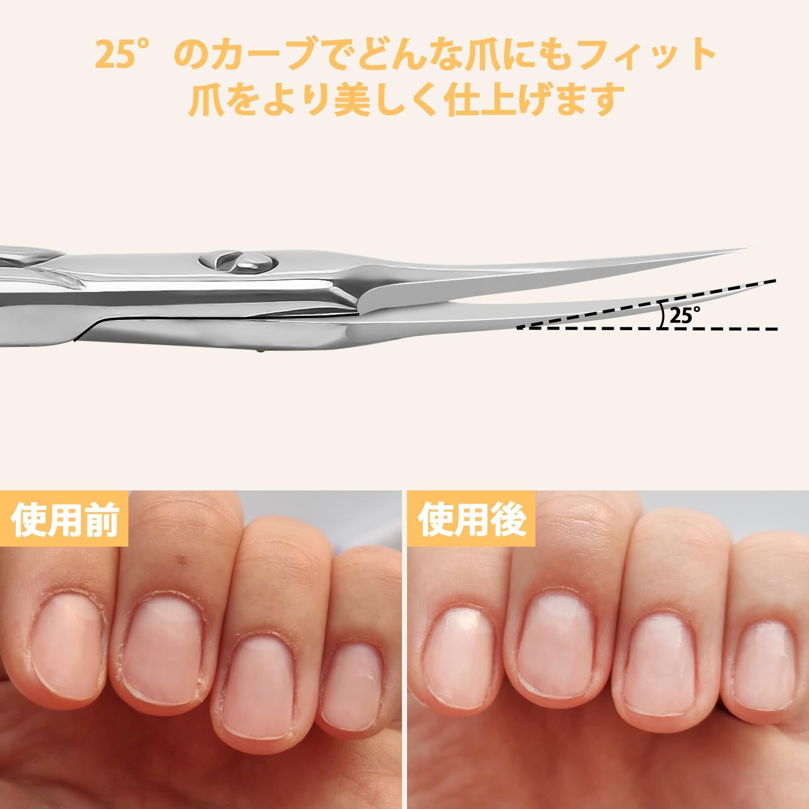 細い先端の曲がった眉毛 ハサミ:曲がったデザインにより、あらゆる角度や形でキューティクルはさみをより正確に操作でき、日常のネイルカットや美容ケアのほとんどの作業に適しています。このデザインは、どの角度や形でも非常に正確なカットを可能にします