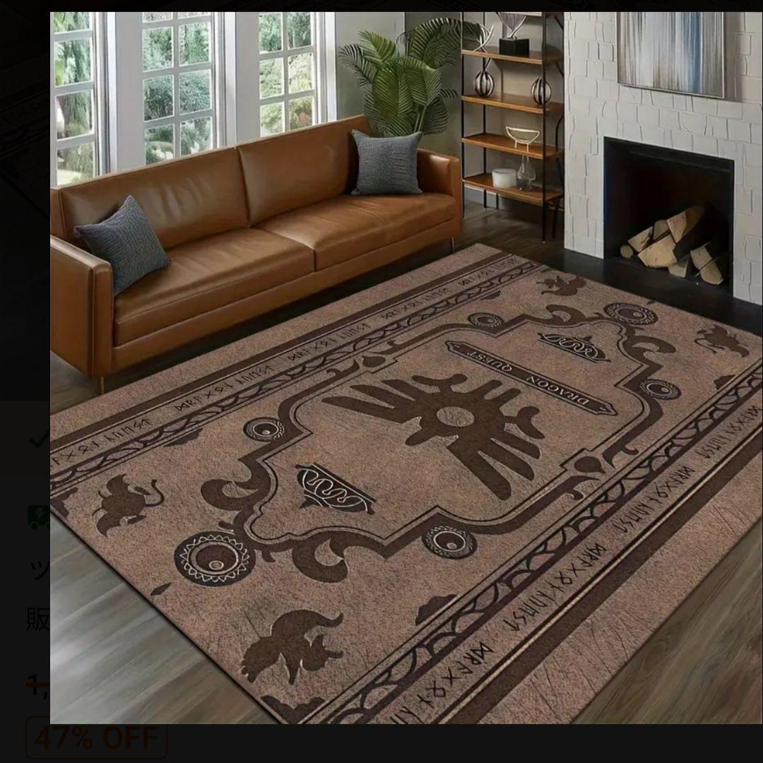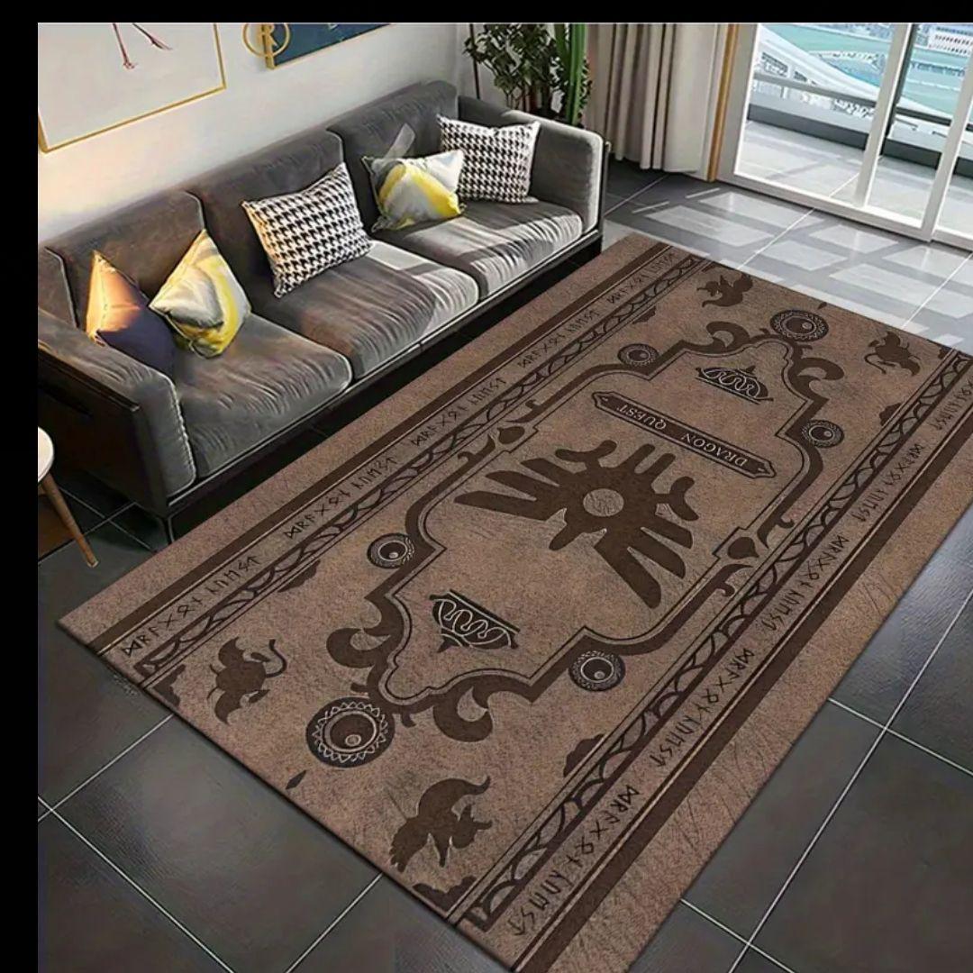 ドラゴンクエストのテーマが施されたブラウンのラグ。ソフトな表面と耐久性のあるエッジで、インテリアに最適。 大きさ:50×80cm - 素材: ソフトな表面、耐久性のあるエッジ、プラスチックの裏面