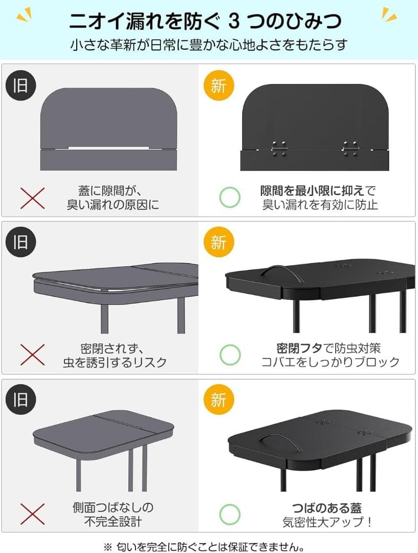 【防臭・防虫対策、清潔な環境を維持】隙間を最小限に抑えた設計が、生ゴミの気になる臭いの拡散を効果的に防止。キッチンの清潔さをキープします。つばのあるフタがゴキブリやコバエなどの害虫侵入も防いでくれます。