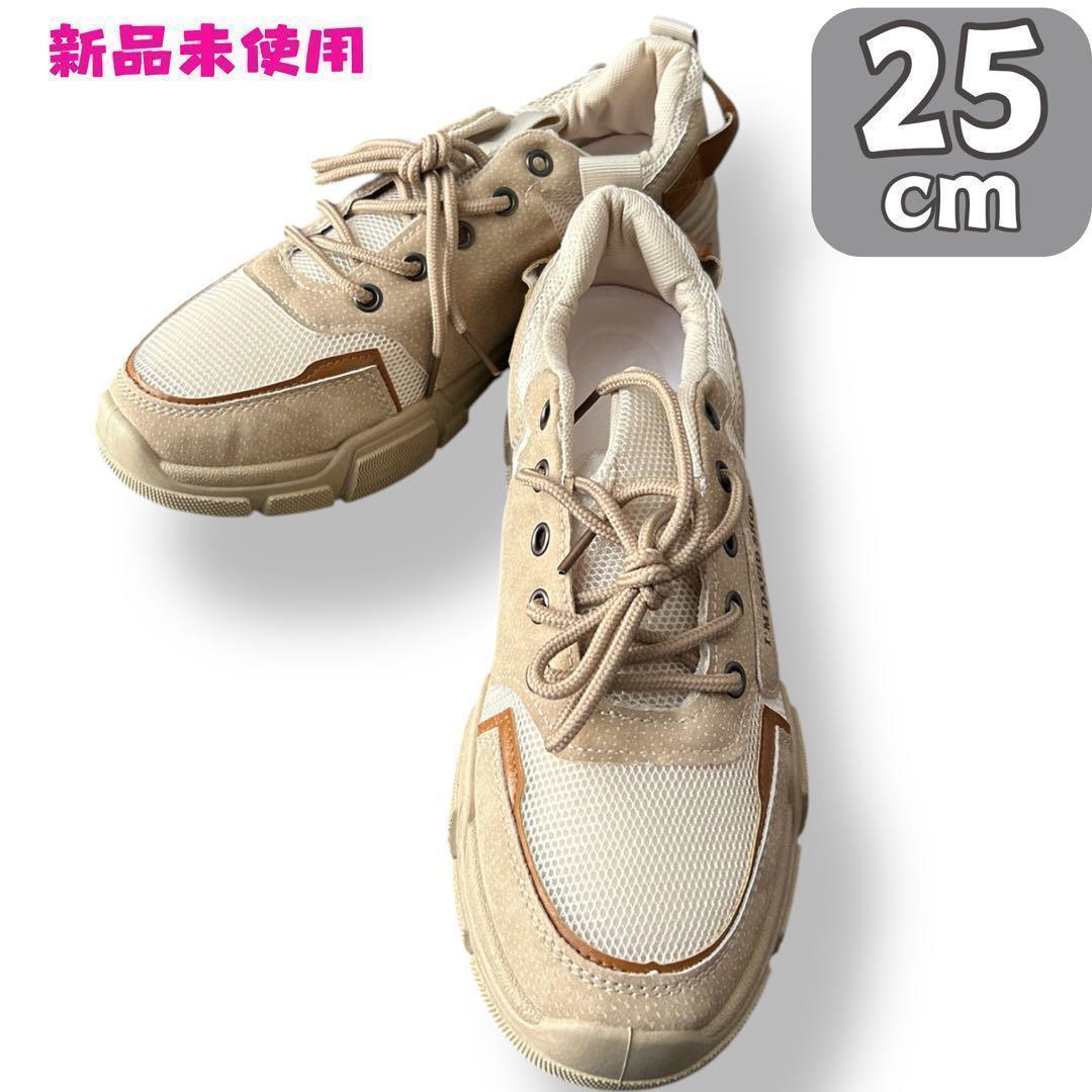【新品】スニーカー 25cm 靴 メンズ レディース ベージュ レースアップ