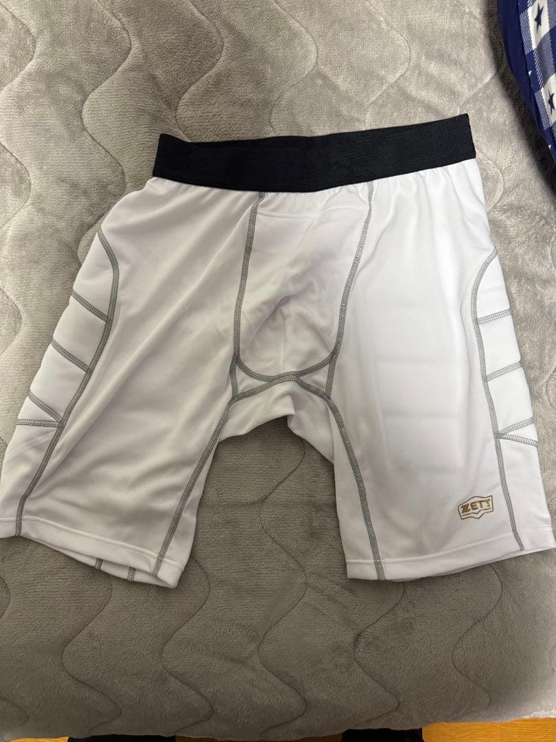 グレーのラインが特徴的なホワイトのOサイズスライディングパンツ。 - 色: ホワイト - デザイン: スライディングパンツ - 特徴: グレーのライン入り - ウエストバンド: ブラック ご覧いただきありがとうございます。