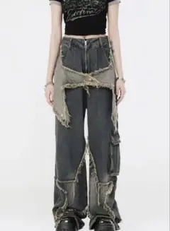 デニムパンツ メンズ パンク ヘビーデューティー ウォッシュ加工 ヴィンテージ ストリート系 デザイン性 ダブルポケット ストレート 綿混 カジュアル ロングパンツ オールシーズン