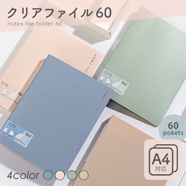Nusign クリアファイル A4 60ポケット 4色展開 くすみカラー シンプル スタイリッシュ ファイル ケース 書類 収納 オフィス 勉強 卓上 書類ケース 整理 書類整理 ファイル ブルー ピンク グリーン ベージュ deli