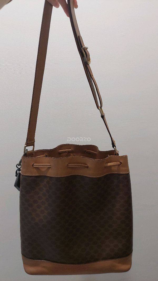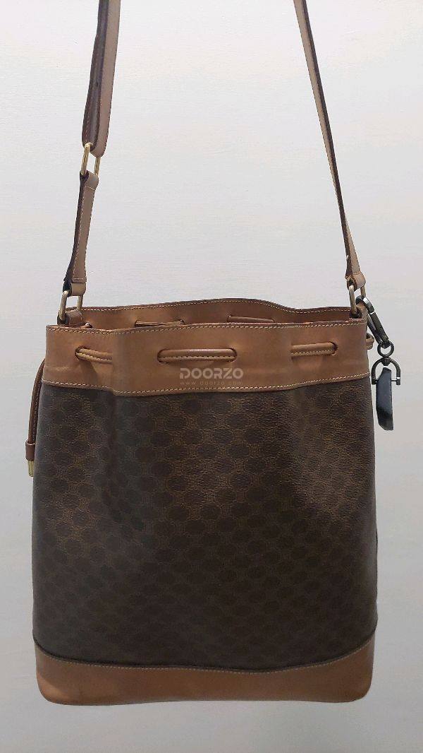 ★CELINE セリーヌ 巾着型 ショルダーバッグ マカダム柄 PVCレザー ヴィンテージ バケツ トリオンフ ブラウン