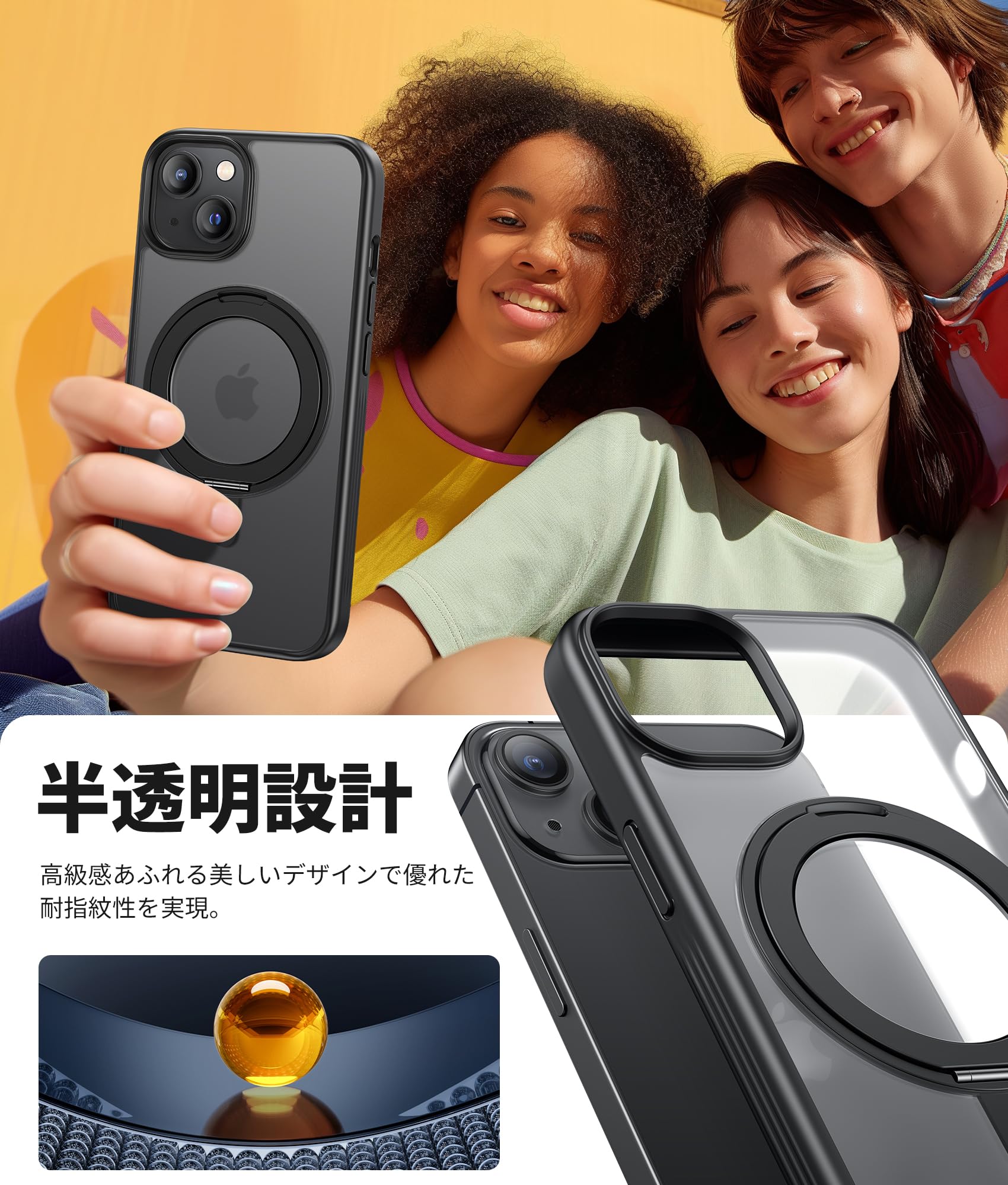 | 商品の追加説明1: | magsafe対応、360°回転スタンド、縦横両対応、強力な磁力吸着・高速充電体験、ワイヤレス充電対応、米軍規格取得、耐衝撃クーション、使い心地よい設計、滑り防止、精確なカットアウト、液晶画面・カメラレンズ保護、指紋防止コーティング、バンパー、黄ばみ防止 |