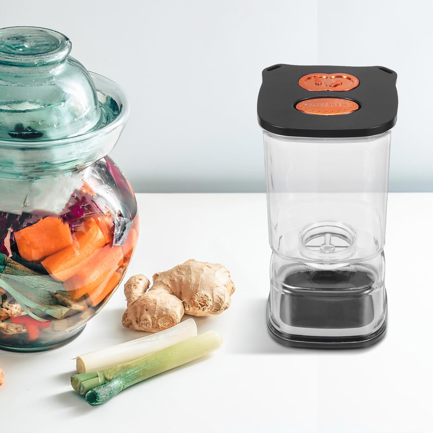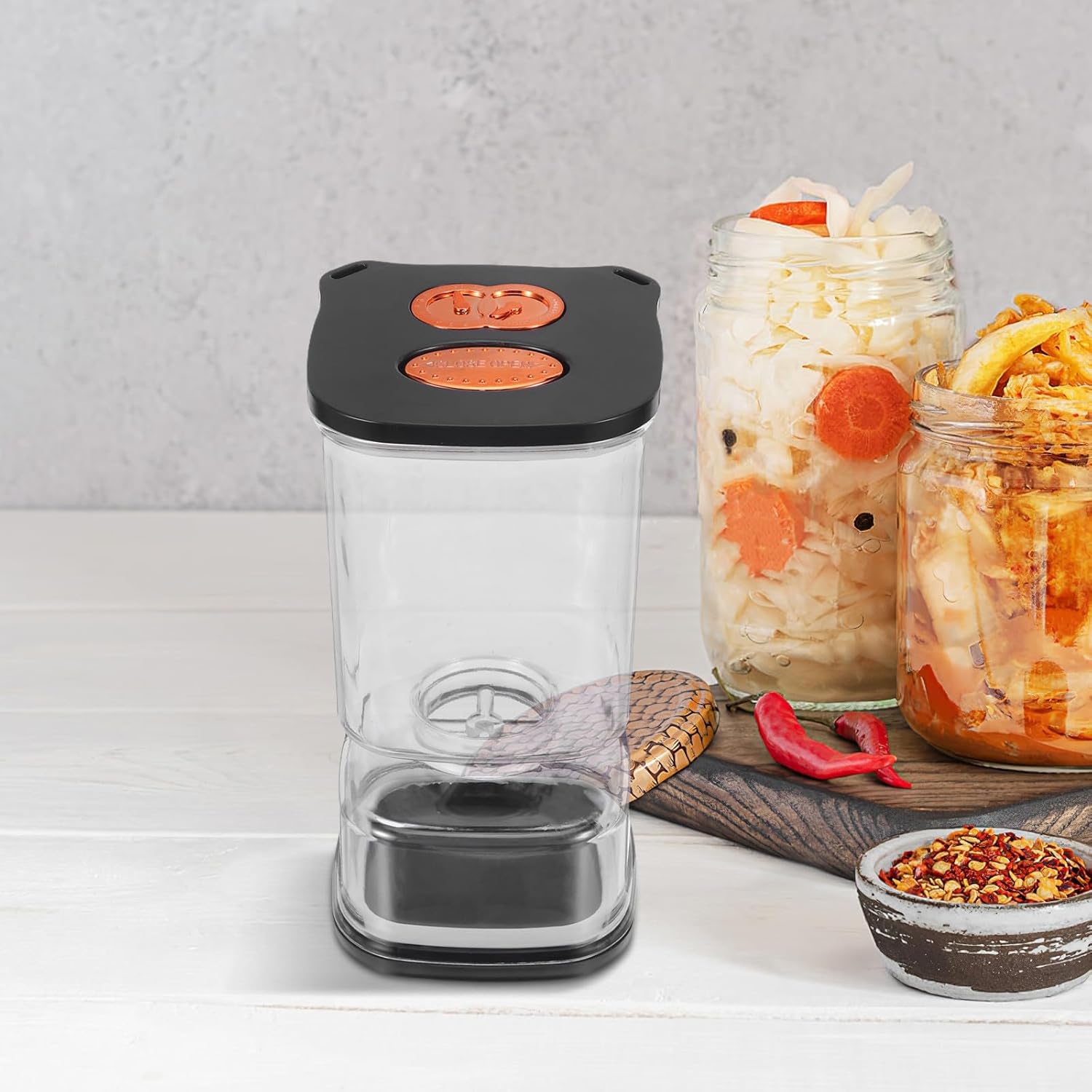 ユニークな砂時計型のこのプラスチック製キムチメーカーは、 で機能的です。ストレーナーが内蔵された発酵瓶のフリップ式蓋で余分な汁を簡単に切り、キムチをシャキシャキとした状態に保ちます。ハラペーニョや漬物の保存に最適で、ご家庭のパントリーや冷蔵庫でキムチの透明容器としてもお使いいただけます。