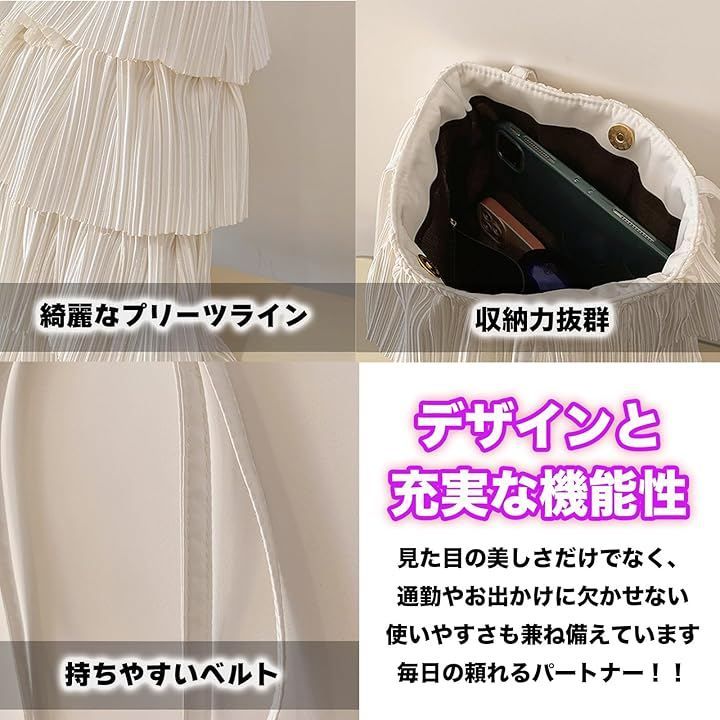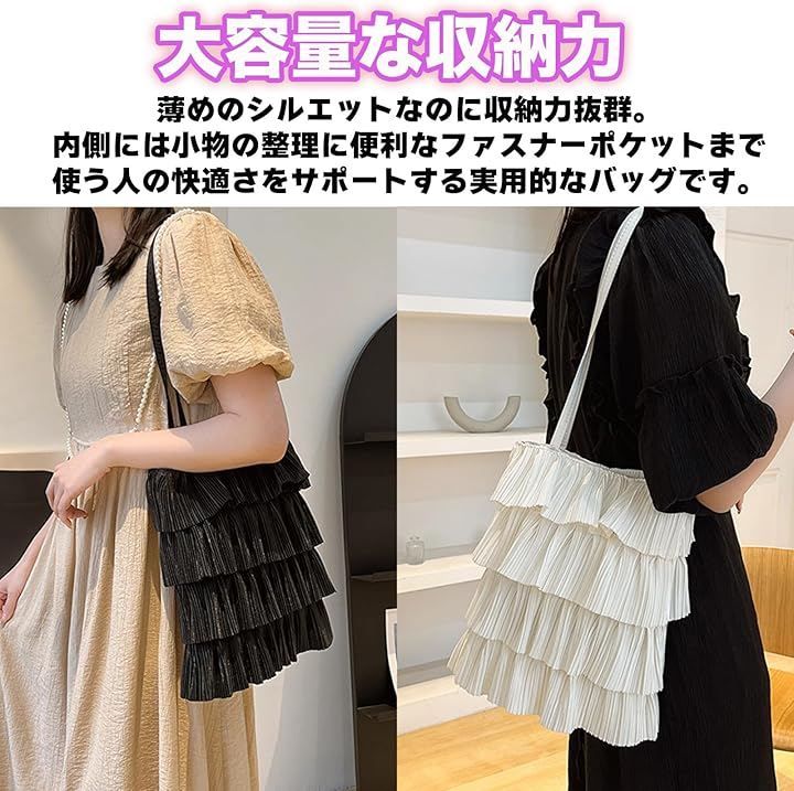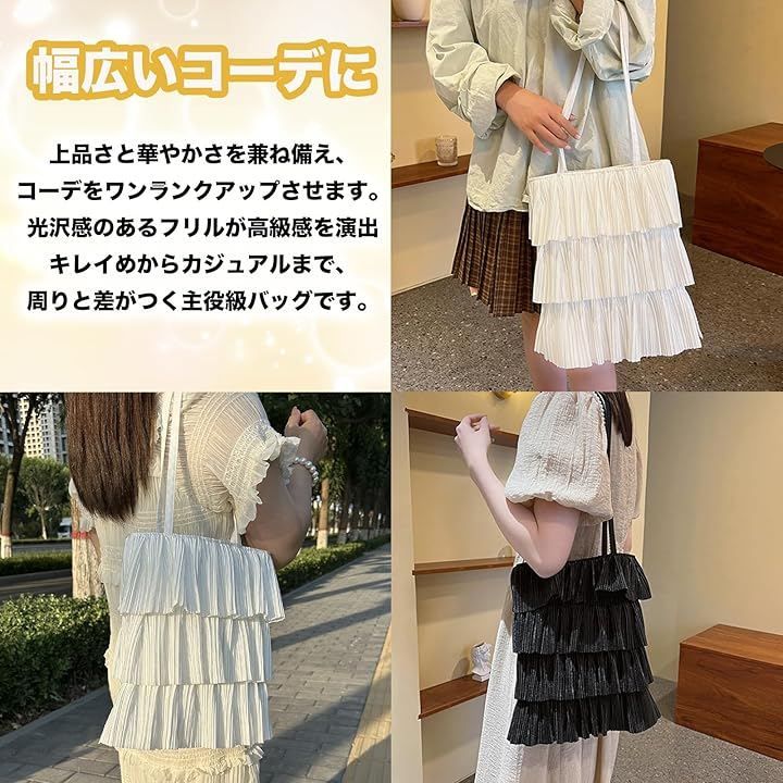 光沢感のあるフリルが高級感を演出し、キレイめからカジュアルまで幅広いコーデに映える、周りと差がつく主役級バッグです。