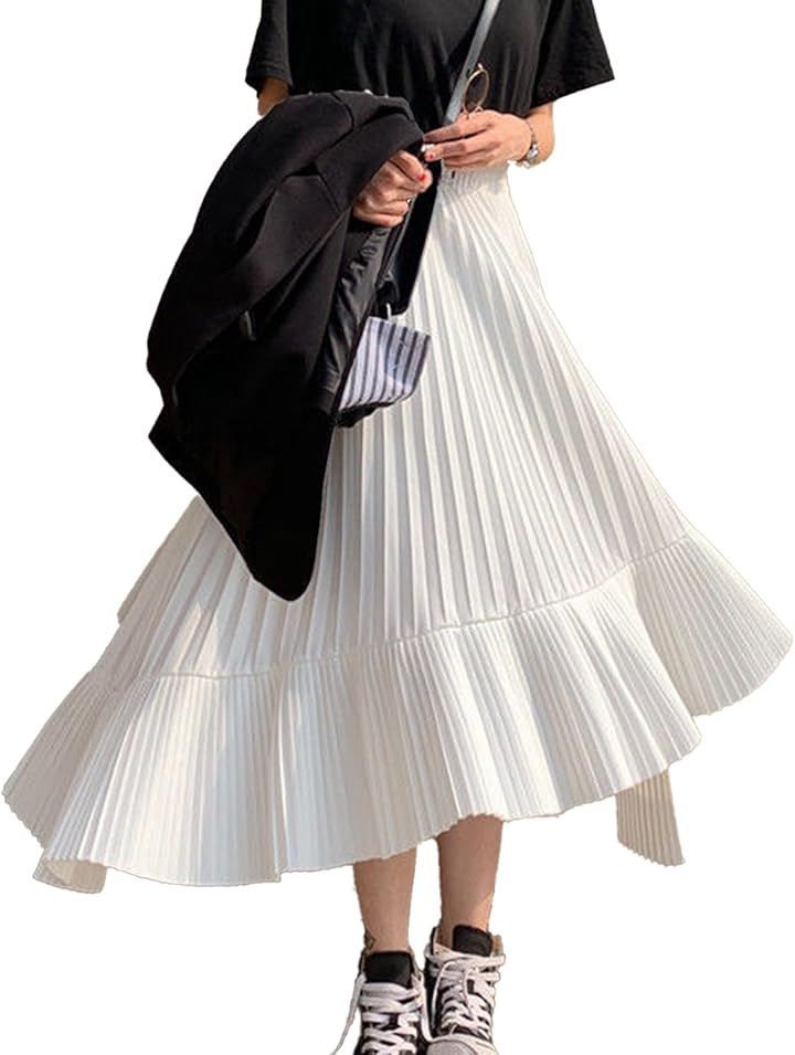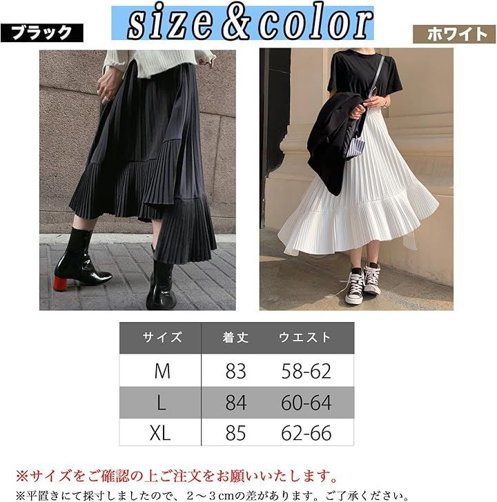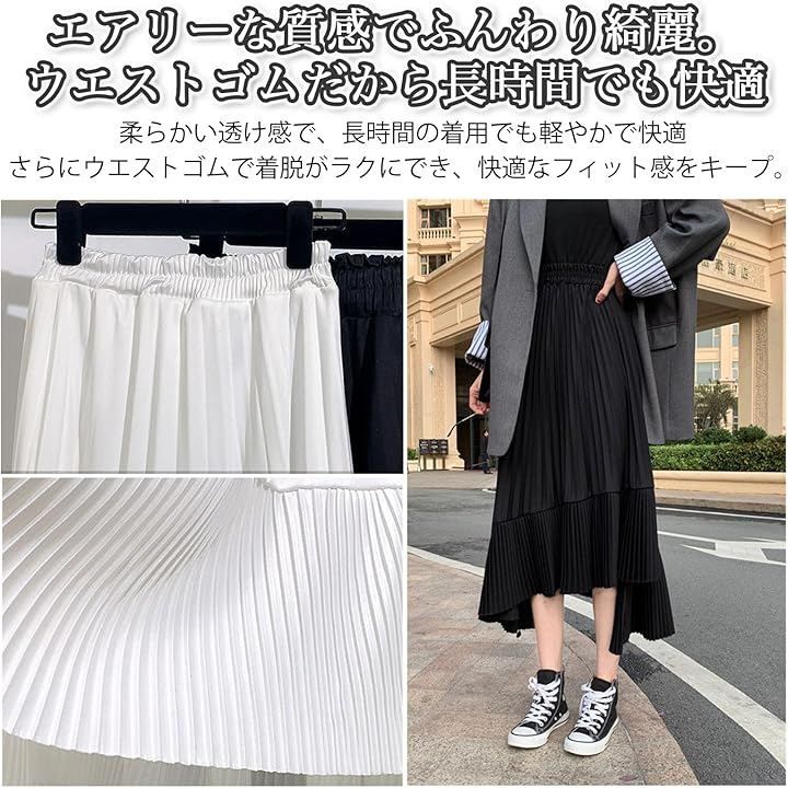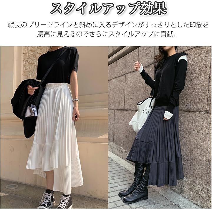 また、不規則なドレープとアシンメトリーが印象的なロングフレアプリーツスカートは、単色でありながら個性的なデザインがワンランク上のおしゃれを演出。