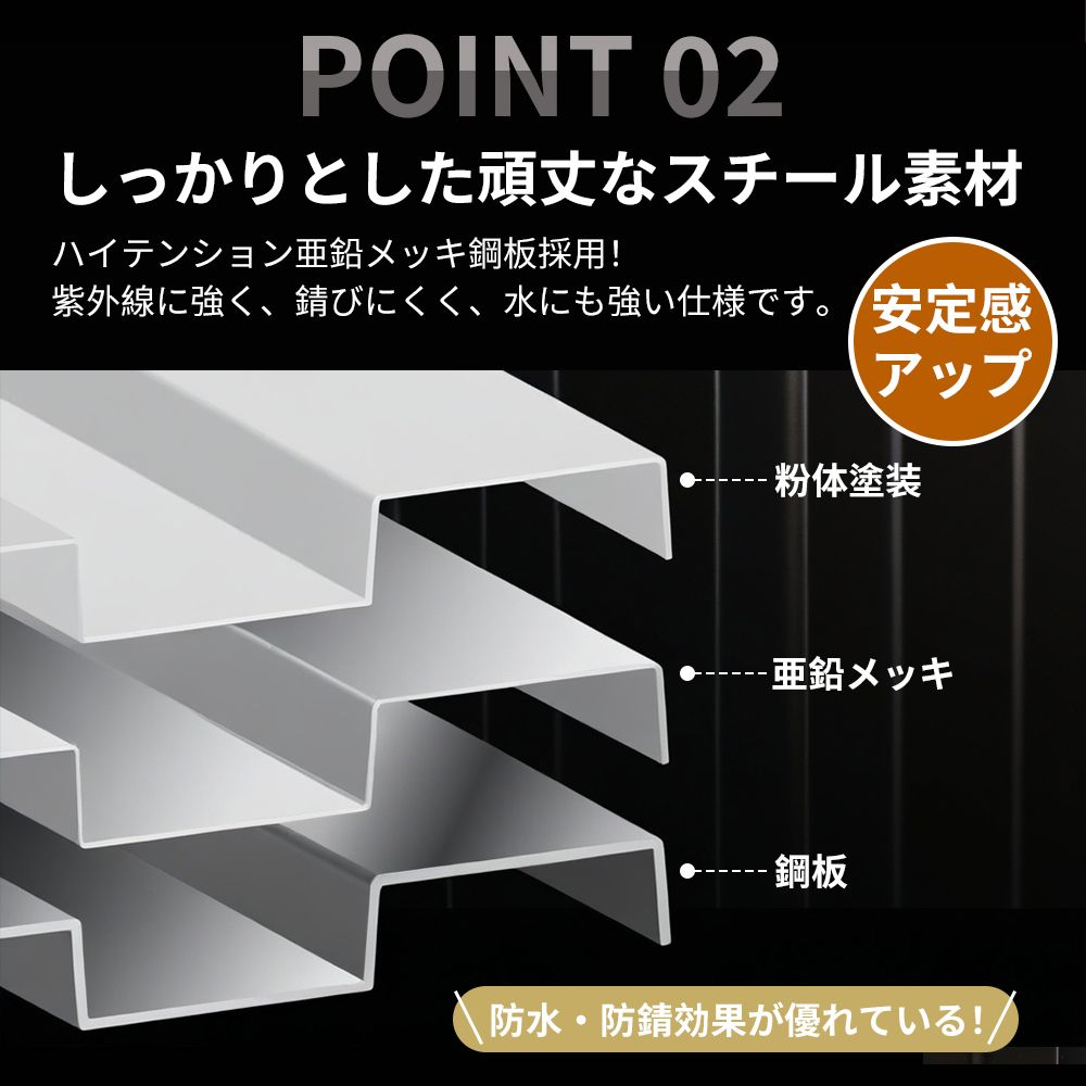 【しっかりとした頑丈なスチール素材】ハイテンション亜鉛メッキ鋼板採用!紫外線に強く、錆びにくく、水にも強い仕様です。防水・防錆効果が優れている!