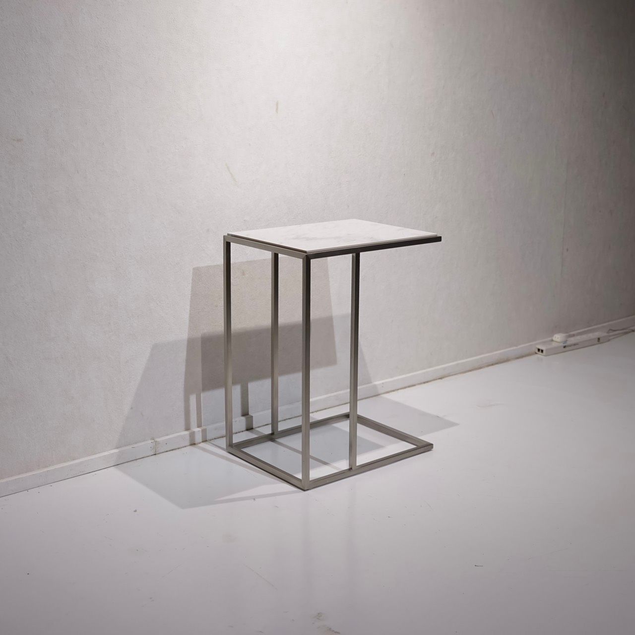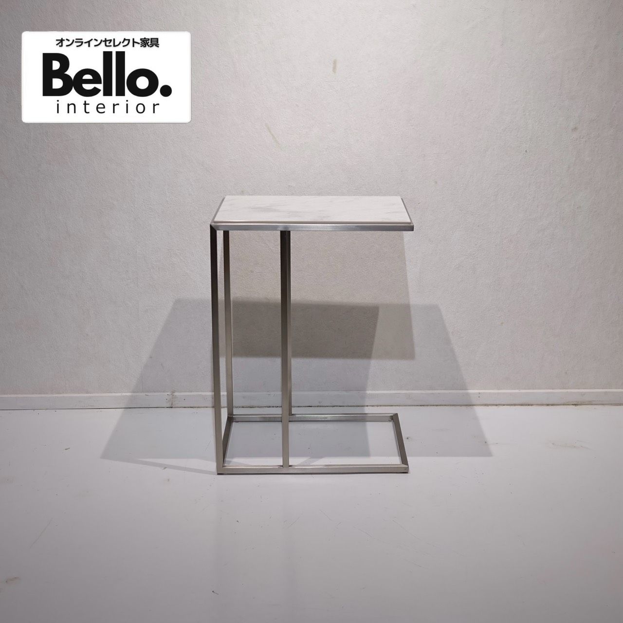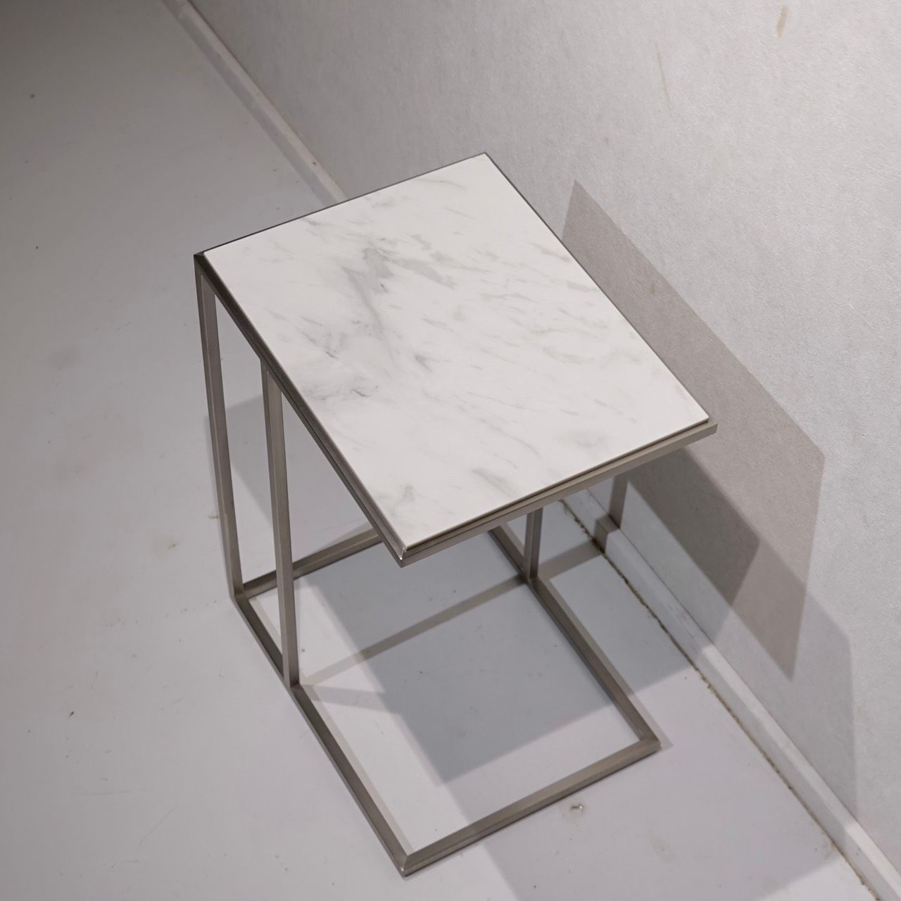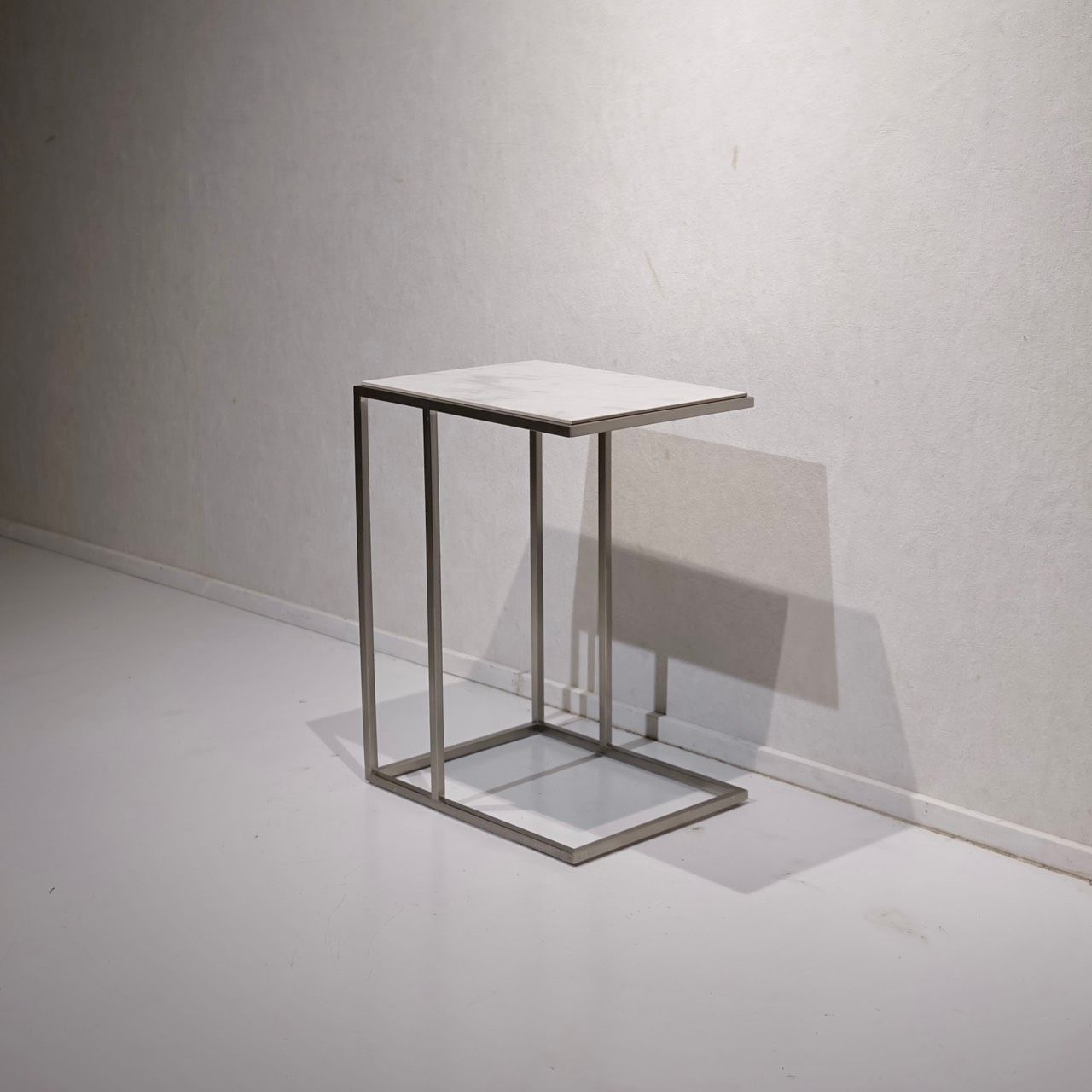 直線的なステンレスフレームと白いセラミック天板の対比が美しい、サイドテーブルのご紹介です。