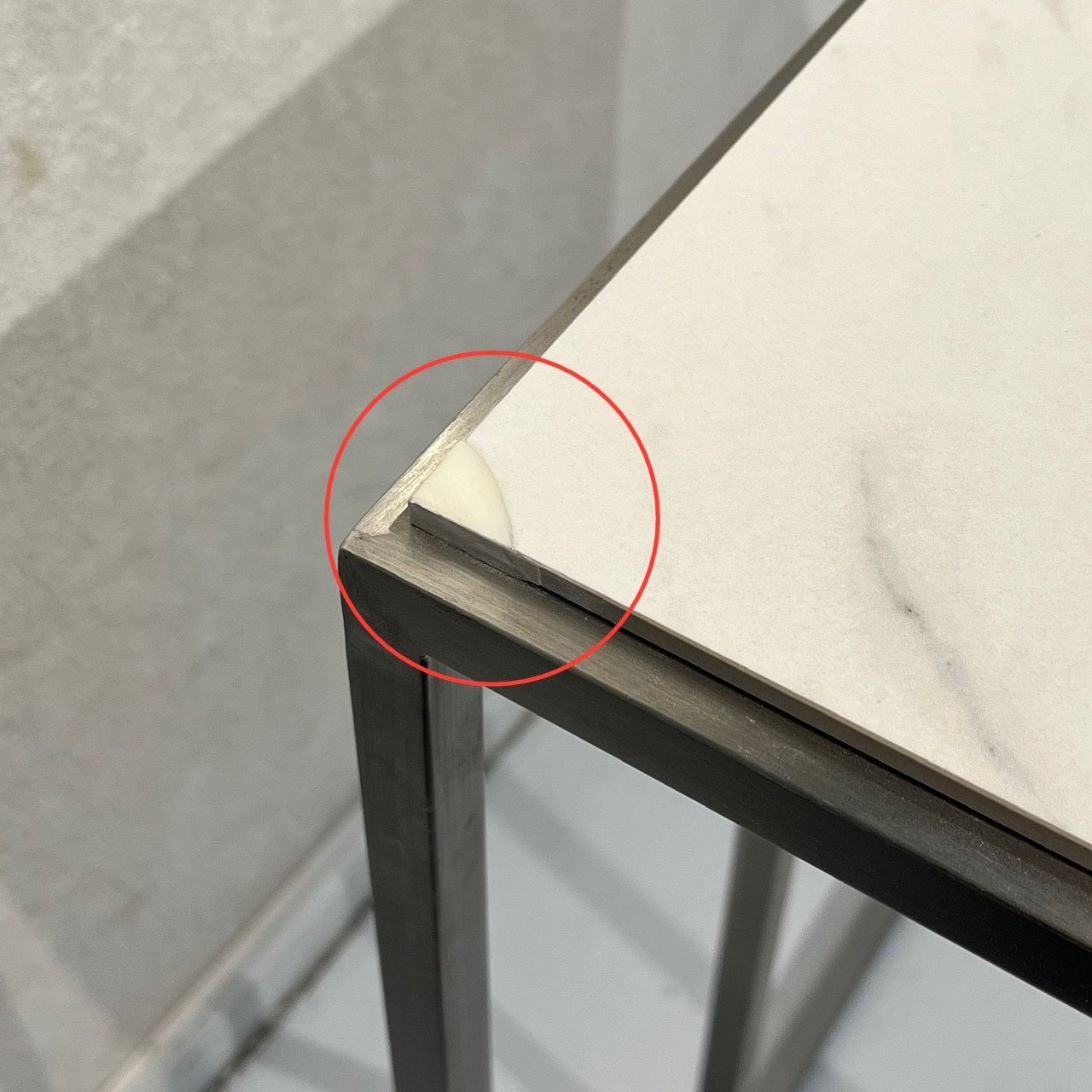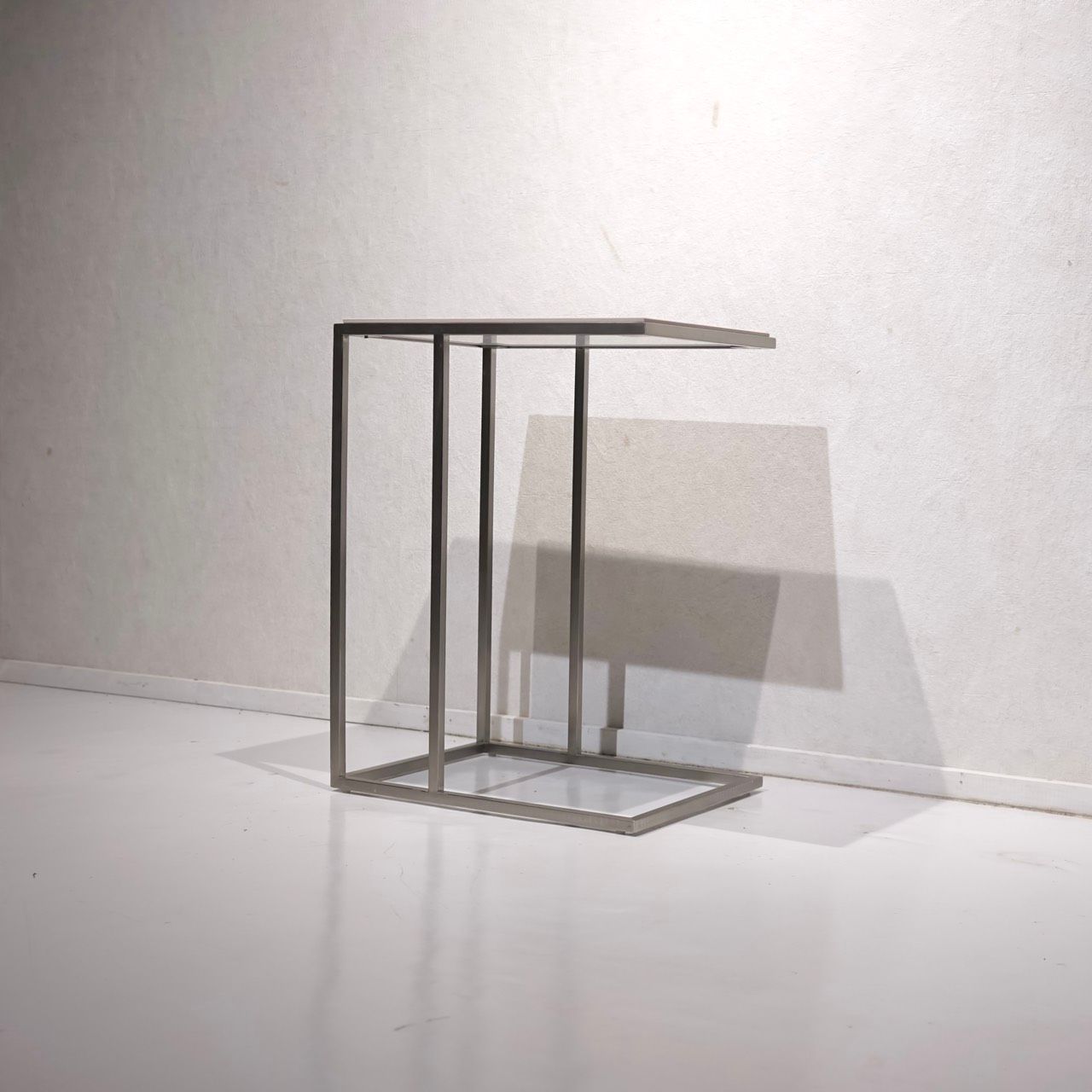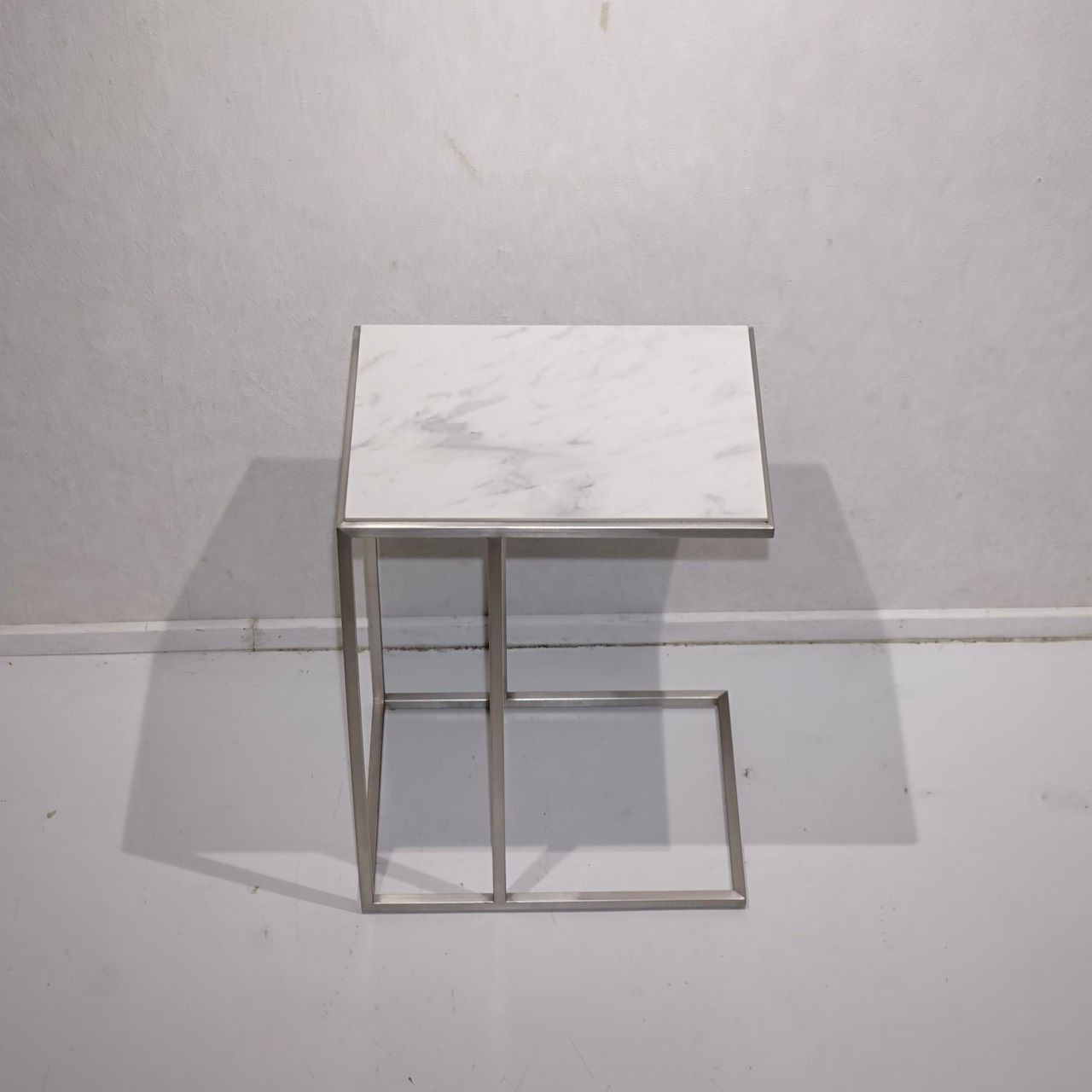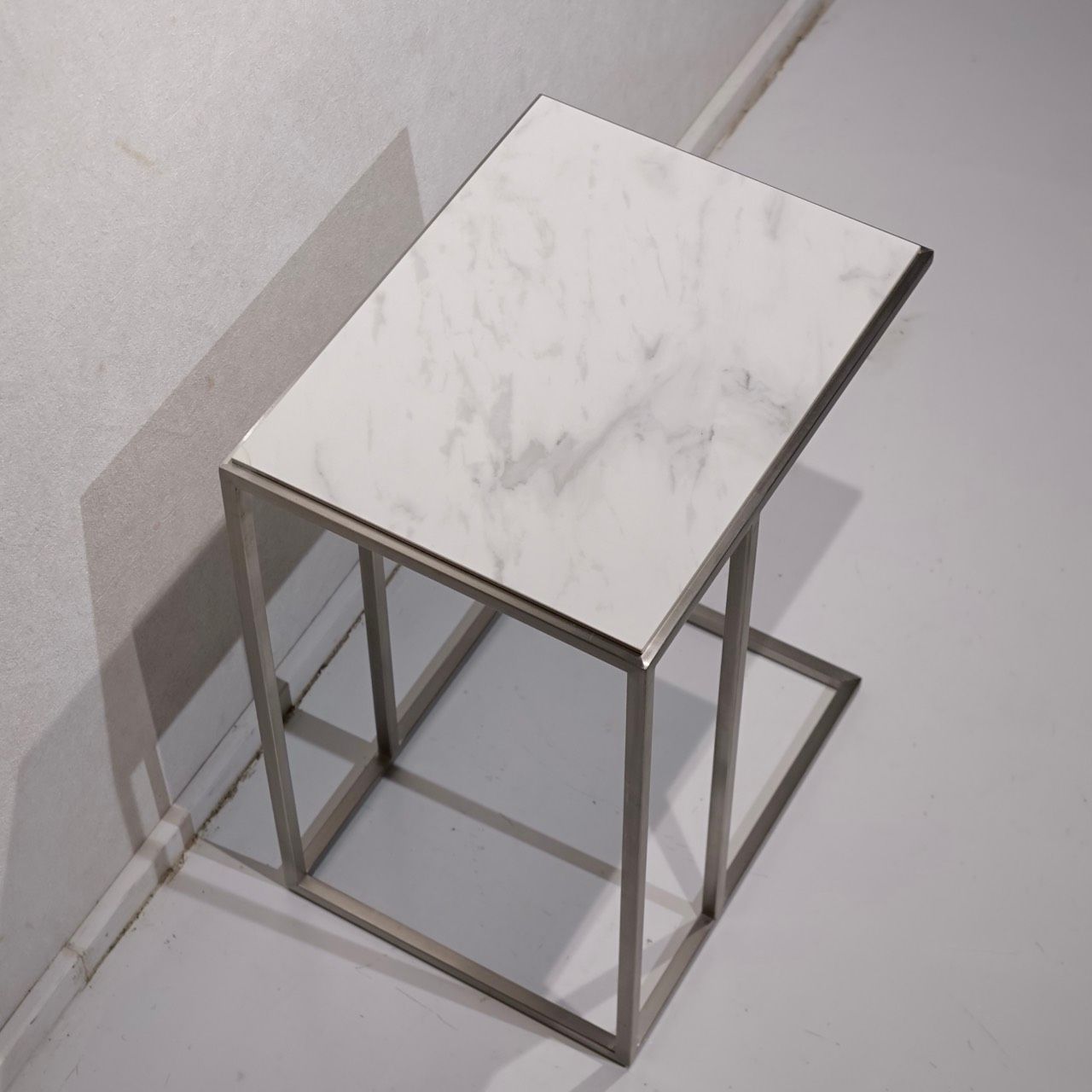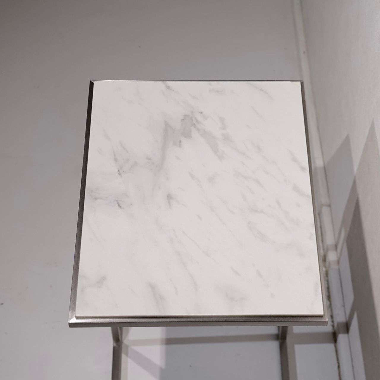 直線的なステンレスフレームと白いセラミック天板の対比が美しい、サイドテーブルのご紹介です。