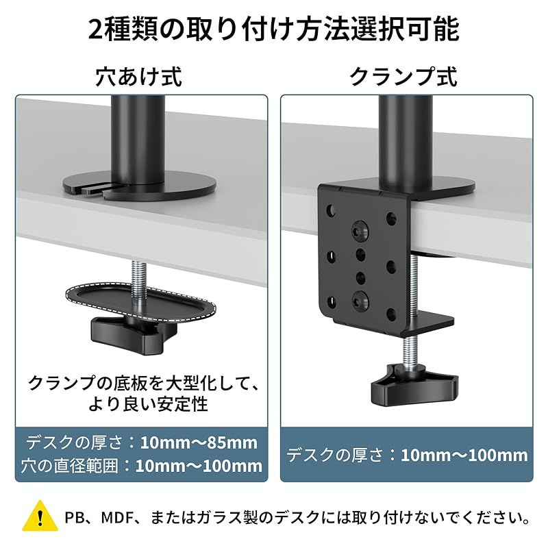 【簡単な組み立てと取り付け】取り外し可能なVESAプレートを採用し、組み立てと取り付けが簡単です。クランプ式とグロメット式の2種類の取り付け方法に対応し、デスクの厚さや形状に合わせて選べます。モニターアーム 2画面は取り付け用の全てのハードウェアと説明書が付属しています。ご使用中、何かご質問&ご不明な点がございましたら、連絡先【アカウントサービス】-【注文履歴】-【販売BONTEC】-【質問する】のほうでお気軽に弊社までご連絡くださいますようお願い申し上げます