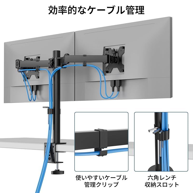 【デュアルモニターアーム】このモニターアーム デュアルは13~27インチのモニターを2台同時にサポートし、各アームの耐荷重は10kgです。VESA規格75x75mmおよび100x100mmに対応しており、様々なモニターを取り付けることができます 【フルモーション調整可能】モニターアームはフルモーション機能を備えており、360度回転、180度の左右スイベル、±90度の上下チルト調整が可能です。アームの高さも430mmまで調整でき、最適な視野角を実現します。ご注意:付属の六角レンチでボルトを締めて傾斜角度を固定します。一方のモニターが低い場合は、ナットを取り外し、付属の六角レンチでボルトを反時計回りに回してモニターを上げます。調整後、ナットを取り付けます 【堅牢な構造】高品質な鋼材とアルミニウム合金を使用し、堅牢性と耐久性に優れた設計。1homefurnit モニターアームはオフィス、家庭、スタジオなど、あらゆる作業環境での長期使用に適しています。統合ケーブル管理システムにより、作業エリアをすっきりと保つことができます。 【人間工学に基づいたデザイン】デュアルモニターアームはモニターの配置を自由に調整できるため、長時間のデスクワークでも首、肩、腰への負担を軽減します。最適な姿勢を保つことで、作業効率と快適性が向上します 【簡単な組み立てと取り付け】取り外し可能なVESAプレートを採用し、組み立てと取り付けが簡単です。クランプ式とグロメット式の2種類の取り付け方法に対応し、デスクの厚さや形状に合わせて選べます。モニターアーム 2画面は取り付け用の全てのハードウェアと説明書が付属しています。ご使用中、何かご質問&ご不明な点がございましたら、連絡先【アカウントサービス】-【注文履歴】-【販売BONTEC】-【質問する】のほうでお気軽に弊社までご連絡くださいますようお願い申し上げます