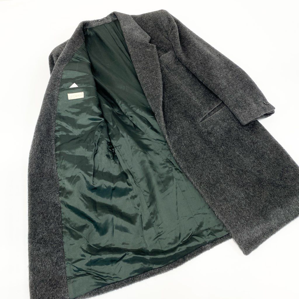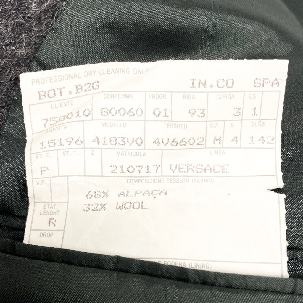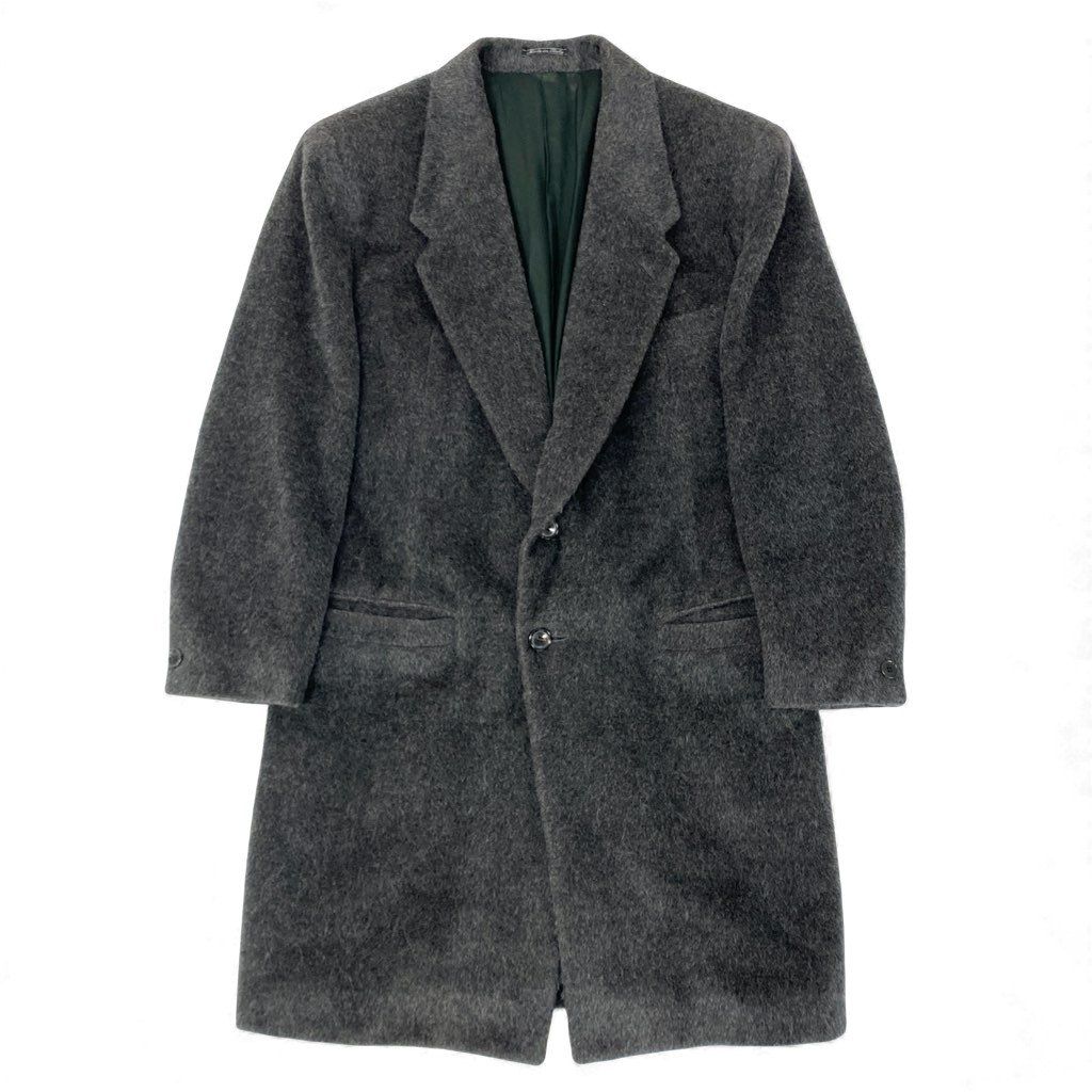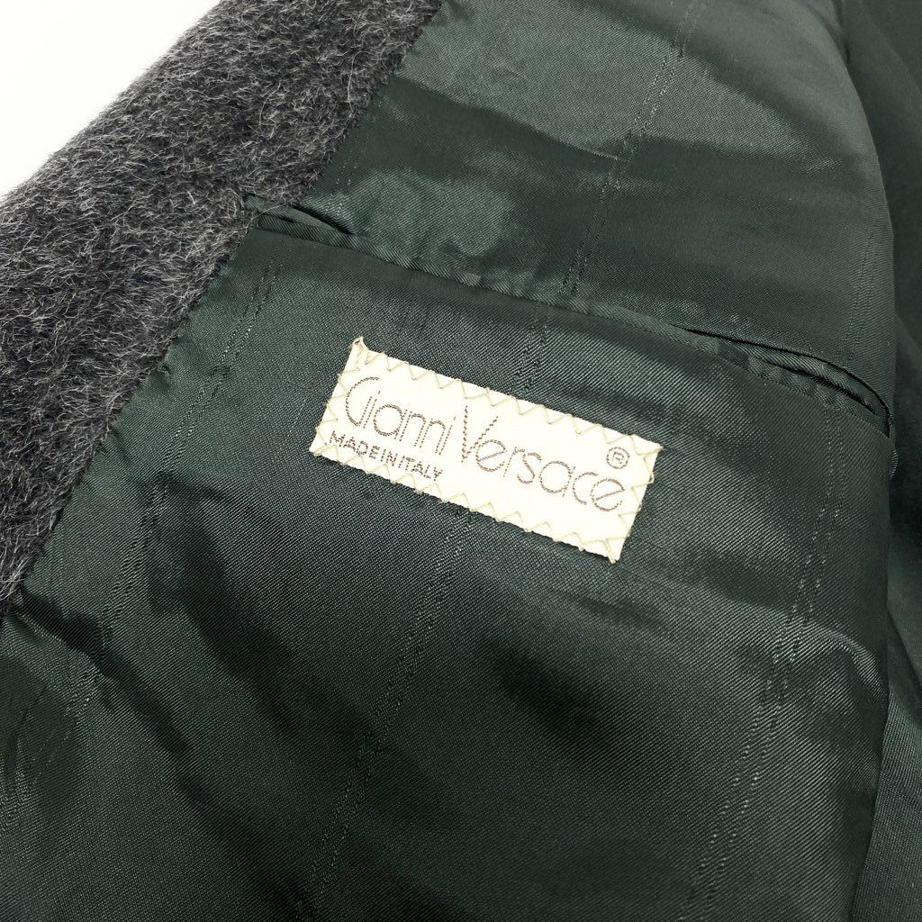 Gianni Versaceらしい存在感を放つ、アルパカ混素材のチェスターコートです。カラーはダークチャコールグレー系で、無地ながら奥行きのあるメランジ調の表情が上品さを演出します。毛足を感じるウール×アルパカのマットな質感で、見た目にも暖かみのある仕上がりです。大きめラペルとシンプルなボタンデザインがクラシックかつモードな印象を与え、きれいめからマニッシュなスタイルまで幅広く活躍します。