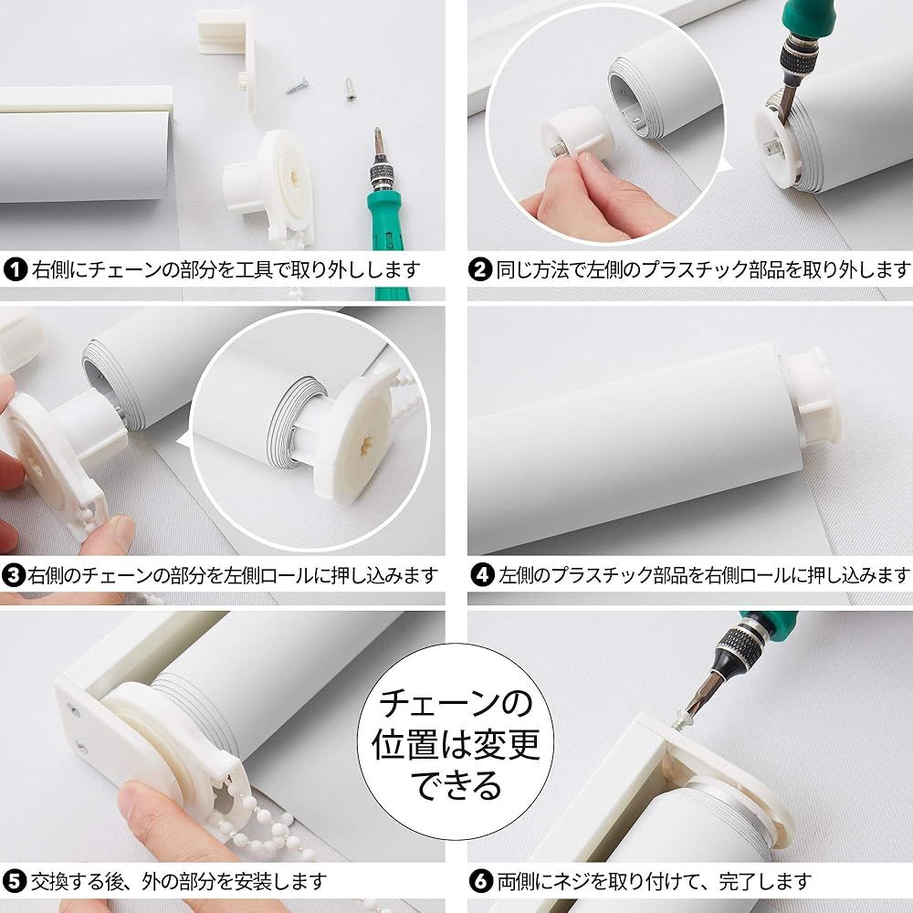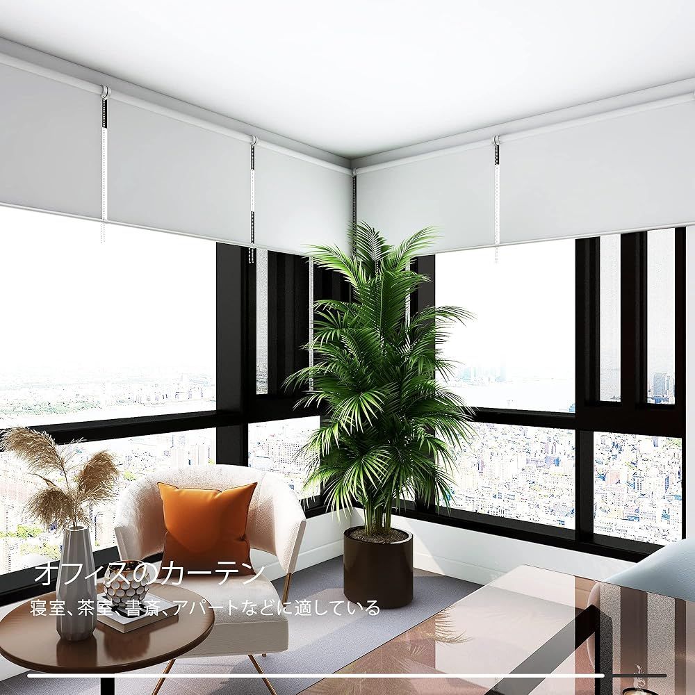 「商品状態」「商品情報 (新品の場合) 」 「主な仕様」【実用な3点セット】ロールスクリーンの表面はポリエステル100%より作られます。ヘッドレールは強度と耐久性を兼ね備えたアルミニウムを採用し、丈夫で長持ちできます。PVCより作られたチェーン式は、プルコード式に比べると安定してゆっくりと巻き上げるので、幅広で丈の長いスクリーンでも簡単に遮光を調整できます。また、留めた状態でも存在感のあるカーテンとは異なり、ロールスクリーンは収納時に筒状にまとまるため、すっきりしたイ メージを作ります。 【快適な使い心地】1級遮光機能より日光をしっかりとシャットアウトしてくれます。UVカット効果もあるため、紫外線による床壁、フローリングや家具の劣化を防げます。また、夏は太陽熱によって室内温度の上昇を抑え、冬は冷気を遮ってくれるので、遮熱保温効果を持ち、季節を問わず快適に過ごせます。冷暖房の効果もアップ するため省エネ効果が期待できます。さらに、シンプルな無地デザインに仕上がり、どんなインテリアにも馴染み、落ち着いた雰囲気を演出してくれます。チェーンは13サイズをご提供し、使用シーンに合わせて自由に選べます。 【幅広く活用】お部屋の間仕切り、見せたくない場所のカバー、お風呂や脱衣所の目隠し、ホームシアターのスクリーンなど多用途でご活用いただけます。キッチン、浴室、洗濯スペース、リビングルームなど幅広いシーンで活躍できます。さらに、リモート会議やオンライン授業の背景としても適用され、在宅ワークの方にもおすすめです。 【取り付け方法】天井付けと正面付けタイプは窓枠にビス穴をあけネジで取り付けます。窓枠内に取り付ける「 天井付け」は圧迫感がなく、窓際にエアコンや家具を設置することもできます。窓枠外に取り付ける「正面付け 」はすき間から入る光や外からの視線をしっかり防ぎます。また、既存のカーテンレールを利用しても簡単に取り付けられ、穴をあけられないため賃貸住宅にも適用します。さらに、チェーンの位置は左右で変えられ、利き手 に合わせるのも便利です。 【ご注意】①商品写真はできる限り実物の色やサイズに近づけるよう加工しておりますが、画像撮影時の状況 や、モニター環境等により実際の商品と多少色味が異なって表示される場合があります。②平置き採寸したの で、素材の特性や置く場所によって誤差がある場合もあり、予めご了承ください。