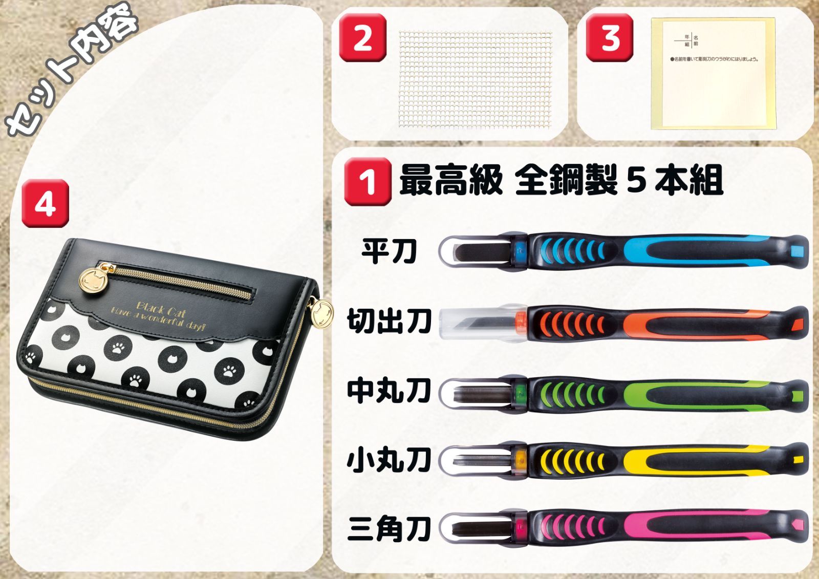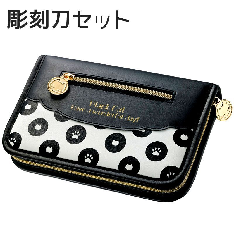 彫刻刀セット モノクロキャット 小学校で使用する女の子向け彫刻刀セット よしはる製 安全ガード付き5本組彫刻刀 猫柄 ネコ ドット 大人気商品☆