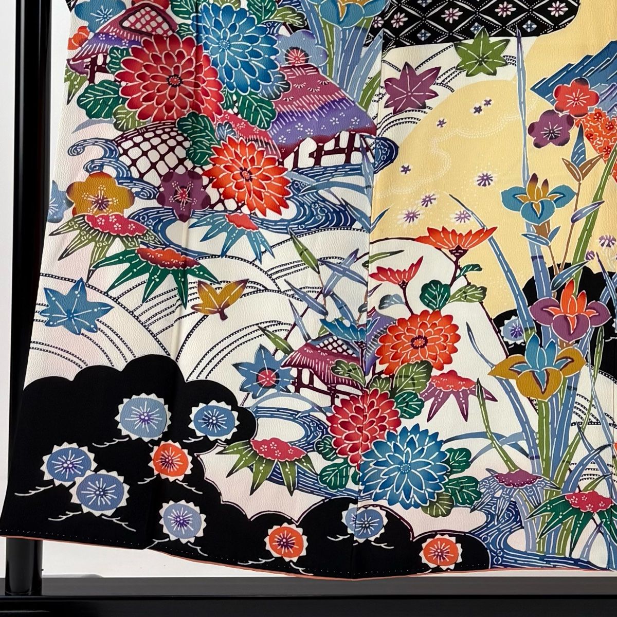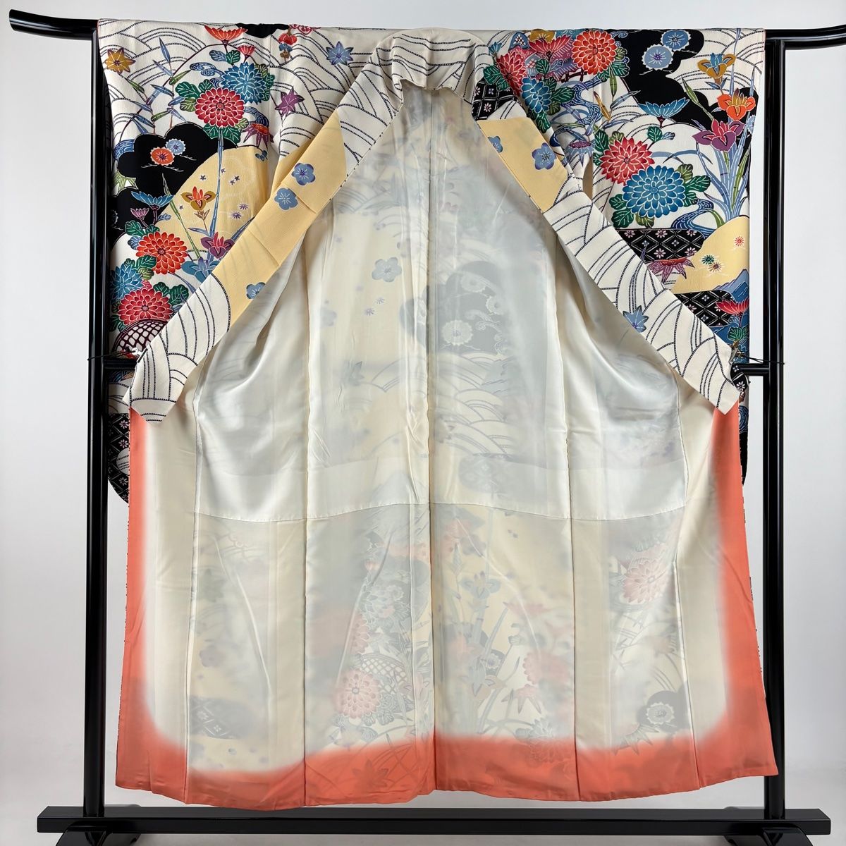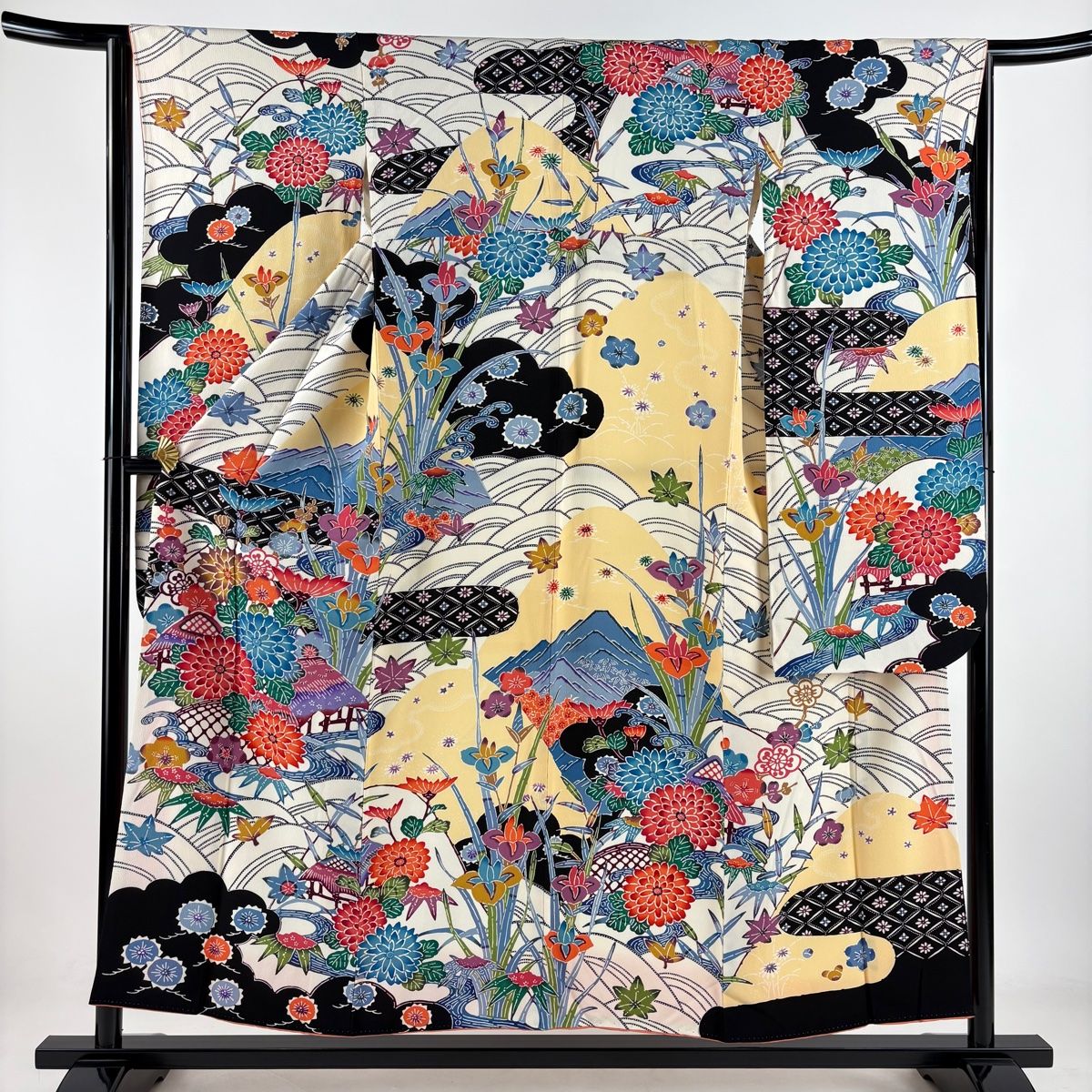 【美品】 振袖 身丈151.5cm 裄丈63.5cm S 袷 菊 建物 縮緬 クリーム 正絹 秀品 【中古】