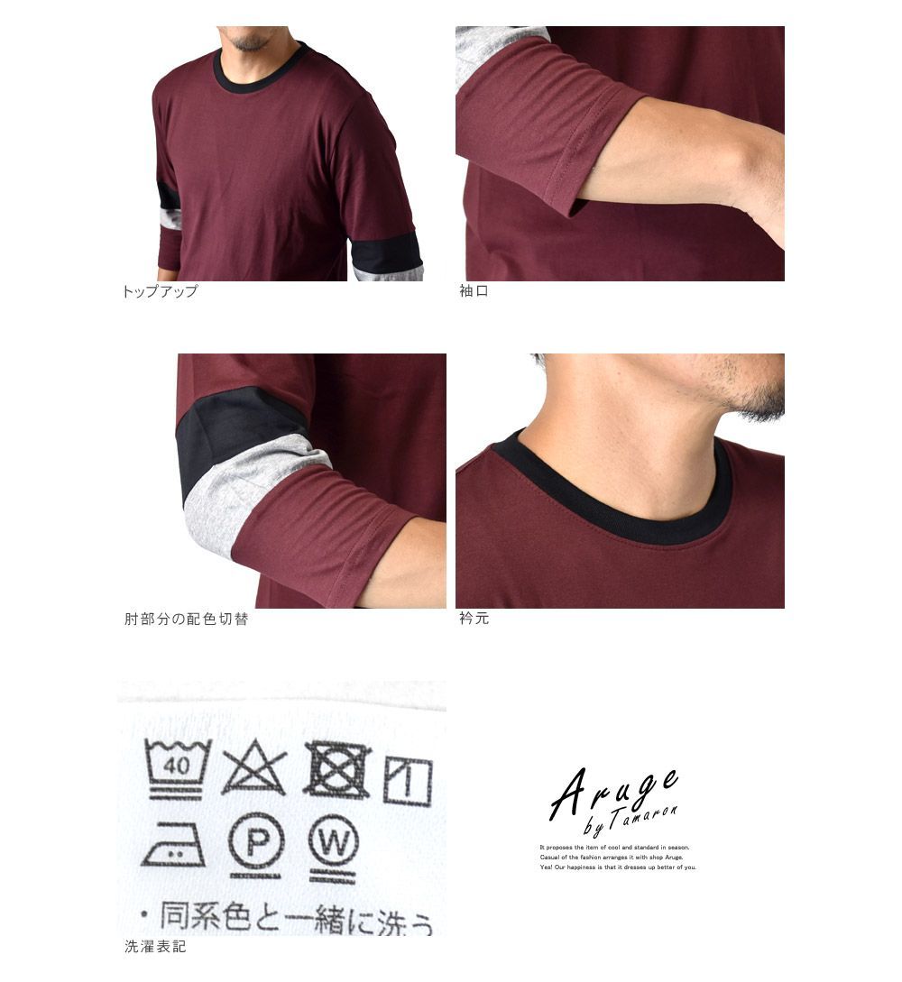肘部分で切替たカラーブロックの配色がお洒落なARUGE完全オリジナルのメンズ7分袖Tシャツ!メーカーを度重なる打ち合わせを重ね完成したこちらの7分袖T!袖部分の切替はシンプルながら存在感を発揮!また、半袖Tシャツの下に重ねても切り替えが見えセンスUP間違いなし!着こなし幅の広い1枚です!