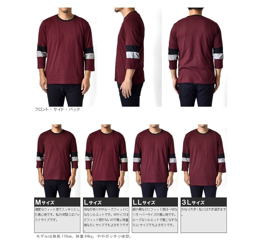 170cm/64kgガッチリ体型です。Lサイズを着用しました。標準的なLサイズで適度に余裕があり楽に着こなせました。配色の衿元や袖切替が個性的でお洒落!無地+切替の控えめデザインが嬉しい!。