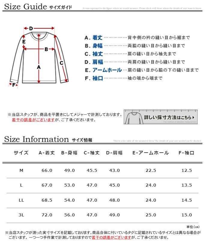 LLサイズ 着丈:68.5 身幅:54 袖丈:47 肩幅:48 アームホール:24 袖口:14.5