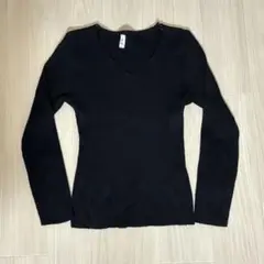黒 Vネック リブ編み 長袖トップス タイト ニット
